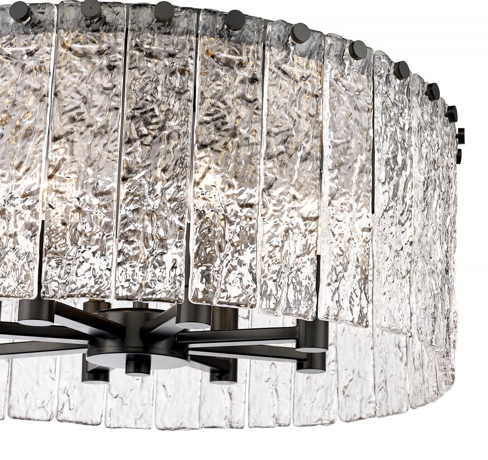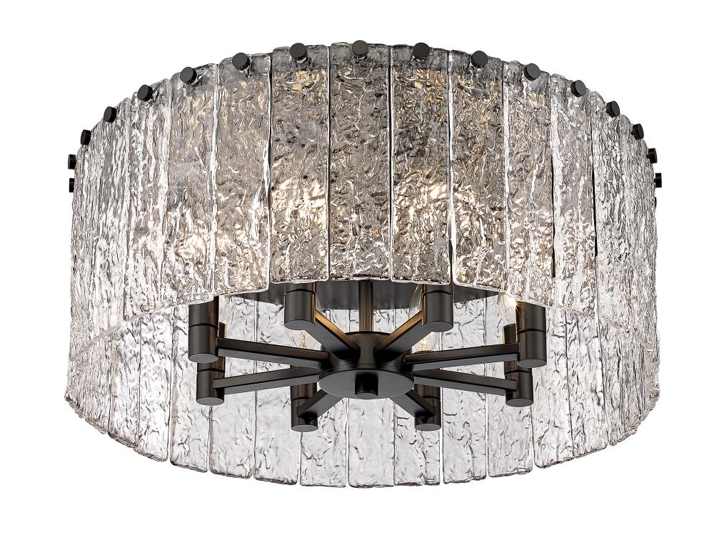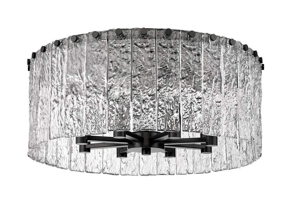 Adding a compelling mix of artistry and natural elements to the mix, this round flush mount ceiling light captures the imagination. The Glacier round eight-light flush mount ceiling light offers a decadent look of individual clear textured glass panels that emulate melting ice, an extraordinary effect with dramatic impact in a foyer, kitchen, or main living area. Matte black finish steel is placed as a crown frame, adding a contrast in both style and finish and embellishing the optical delight accomplished when the fixture is illuminated.