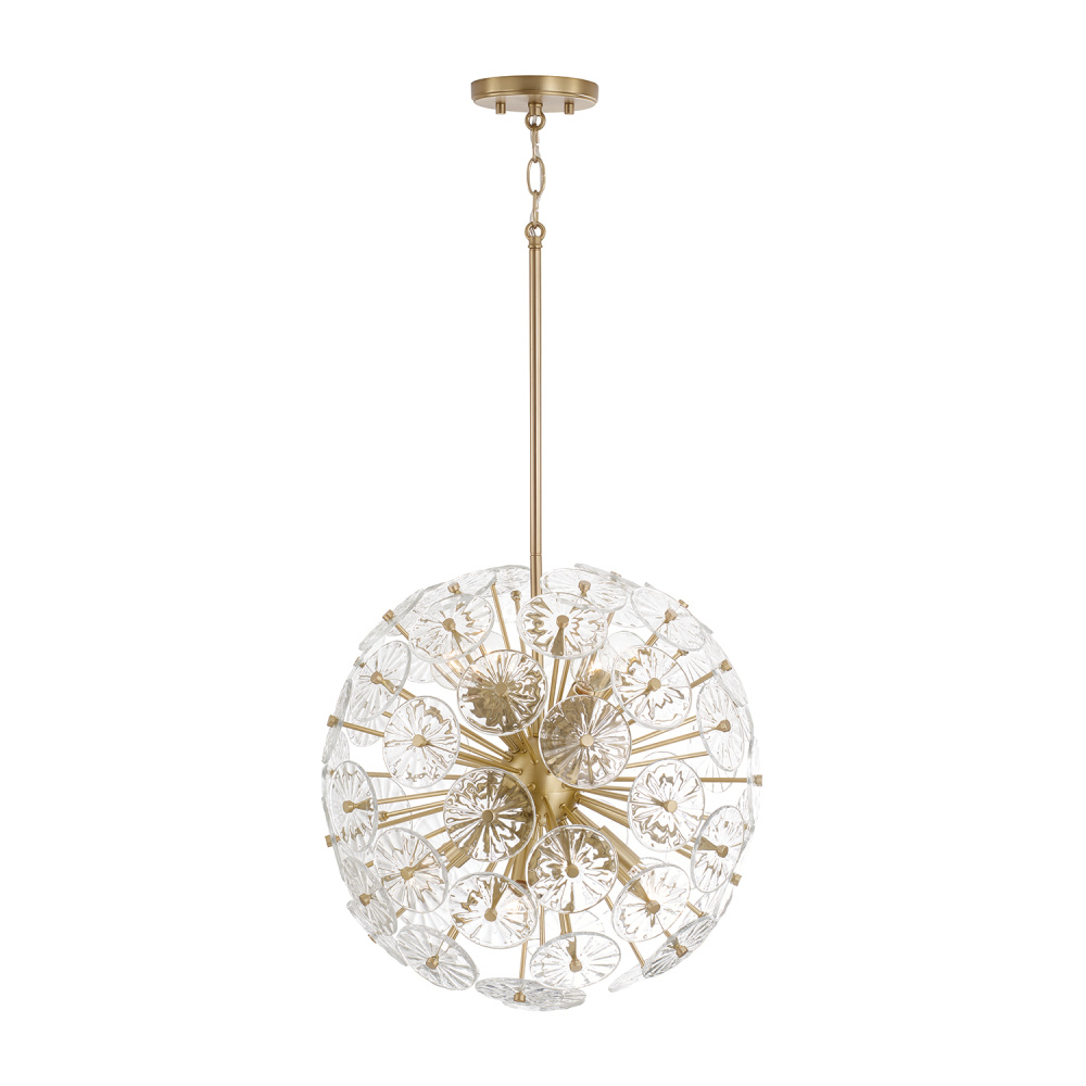 DETAILS: Held by succinct Matte Brass stems, the clear pressed glass petals form a starburst of patterned illumination, bringing elegance to any space.
