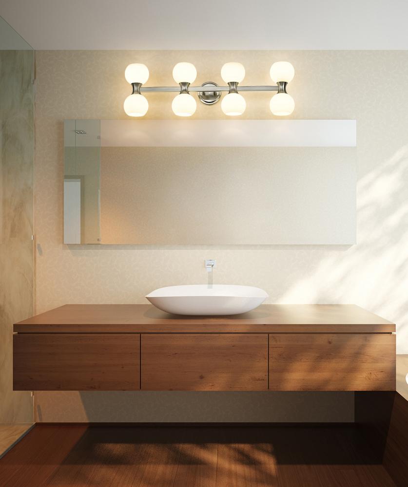Embellishing a custom ensuite or guest bath space is a breeze when iconic Mid-Century Modern style and Art Deco attitude blend to produce a hit. This eight-light vanity light from the Artemis collection checks all the boxes for a compelling design and solid ambient uplighting and downlighting infused by matte opal glass open globes. Linear sensibility joins alluring curves in a sleek brushed nickel finish steel frame, wrapping up a host of decadent features.