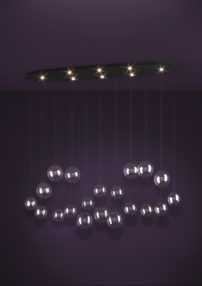 The ESPARDELLO LED pendant light features 8 Integrated LED Lights built into a black oval canopy w/ twenty clear glass spheres in two different sizes suspended below. The suspended glass spheres are bathed in gentle light from above. The integrated LEDs in the canopy create a shimmering effect.