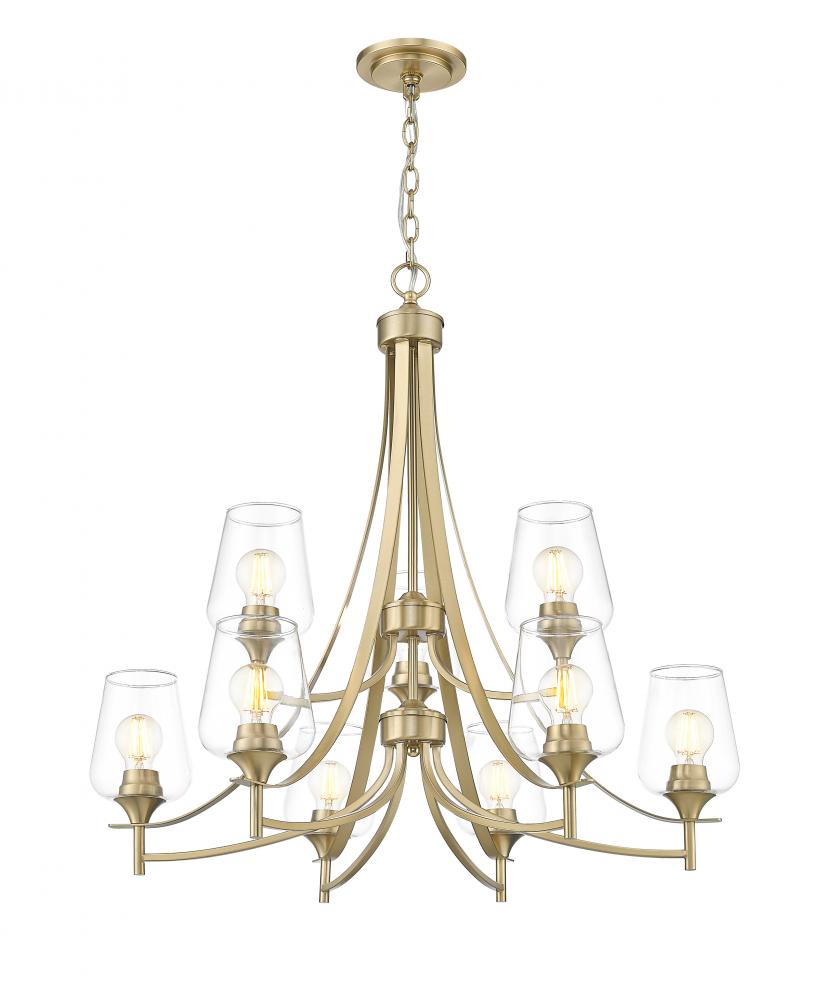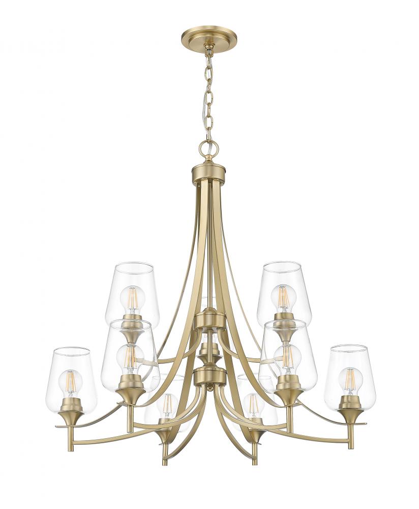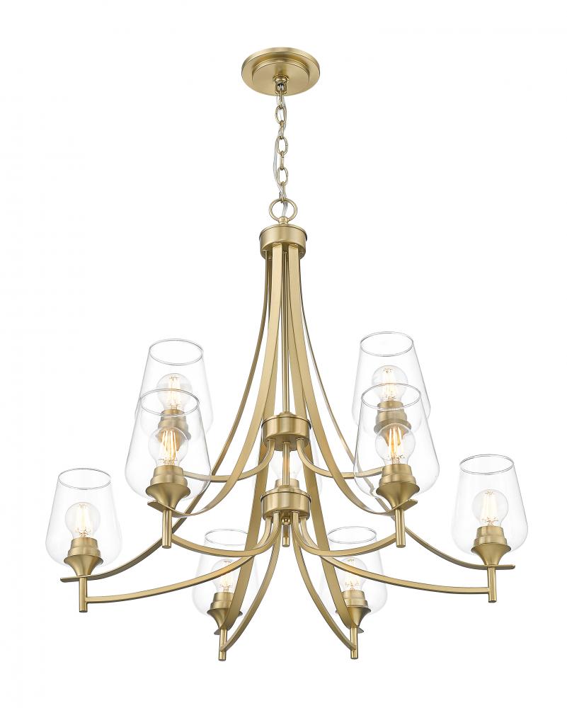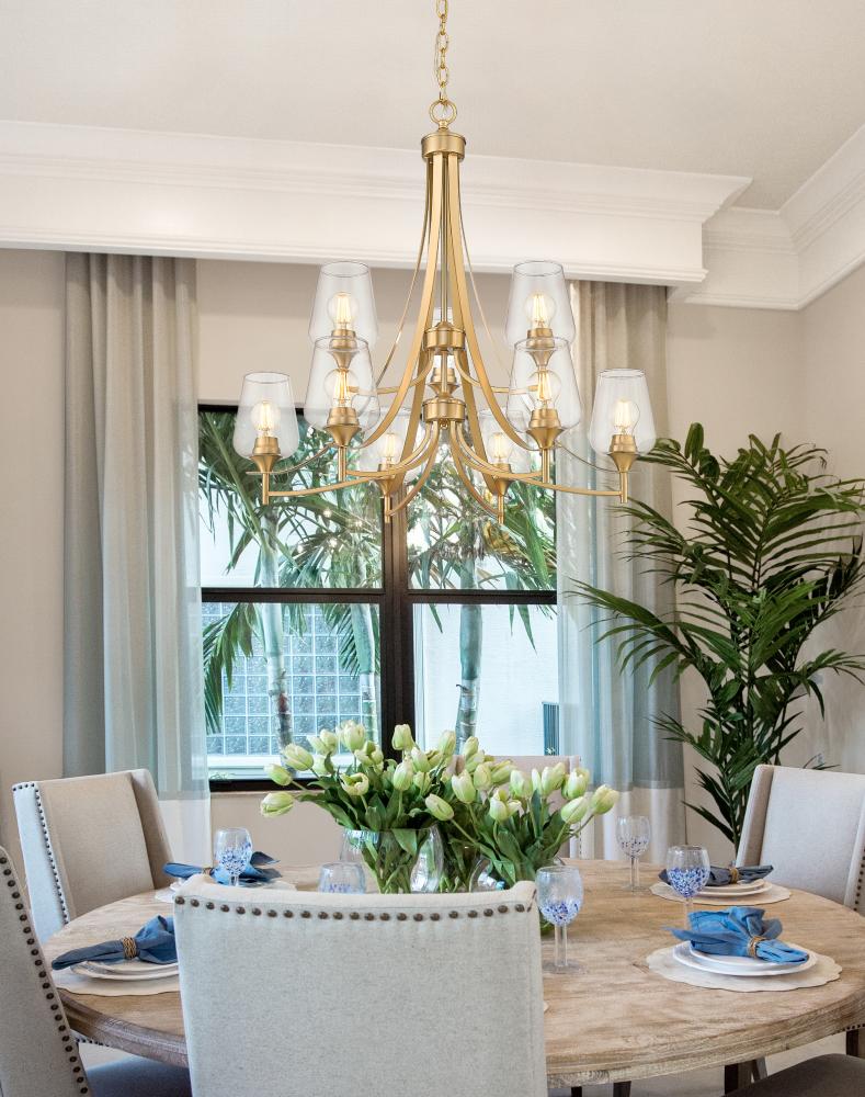 We love the tiered design of a sophisticated light fixture blending burnished brass finish steel and clear glass. Silhouetting is carefully created in a nine-light chandelier offering plenty of dimmable illumination ideal for dining spaces, hallways, and foyers. Gently curved arms form a romantic iteration of geometry, with sparkling glass shades filtering light as needed.