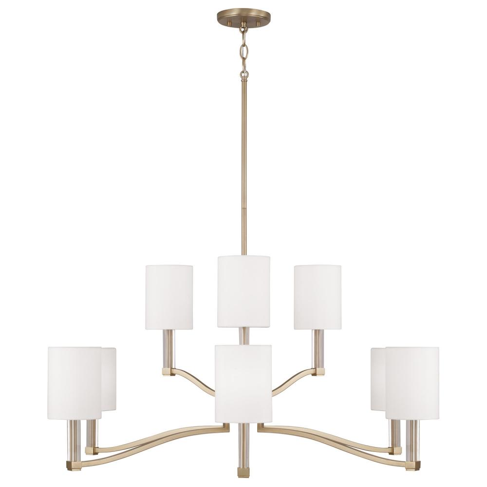 DETAILS: The White fabric shades complement the Matte Brass frame, accented with clear acrylic candlesleeve details for sophisticated design.