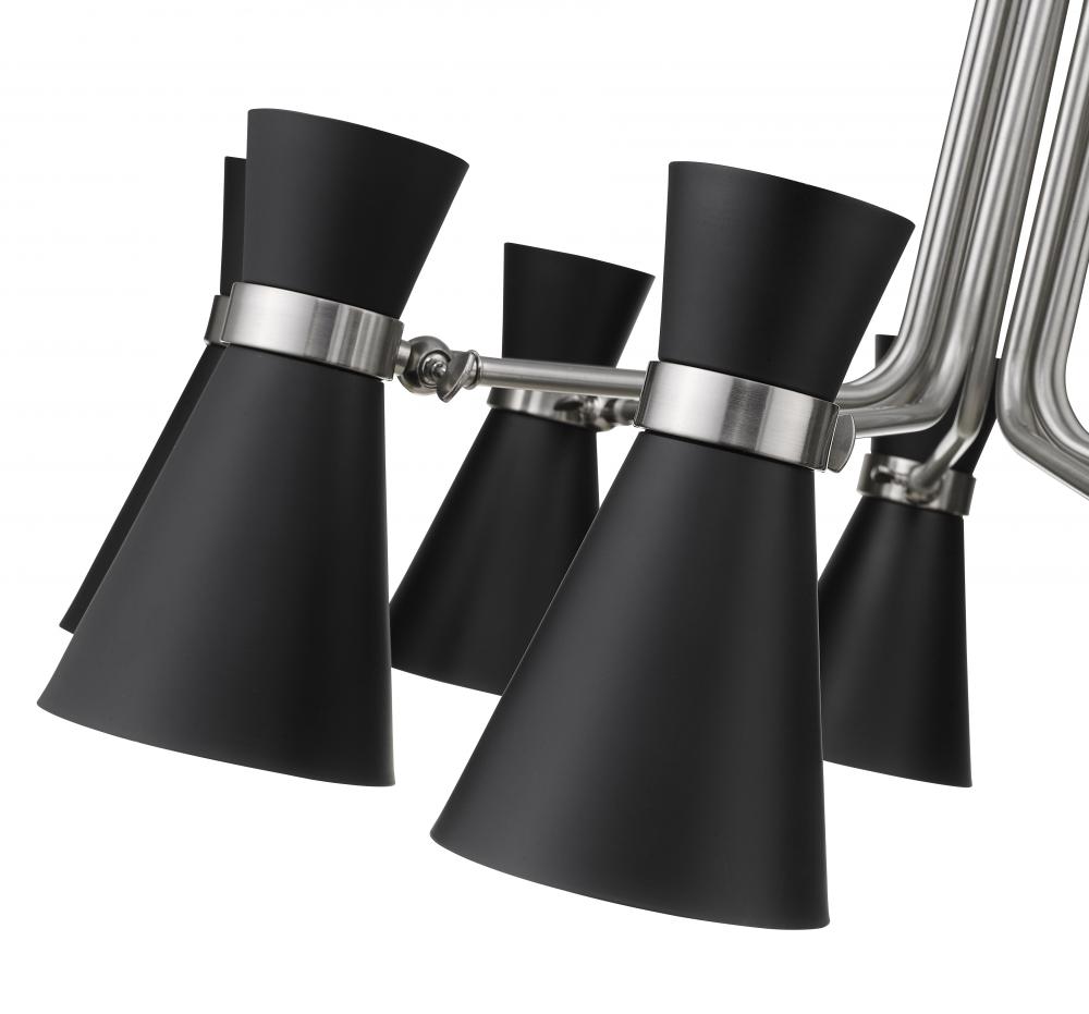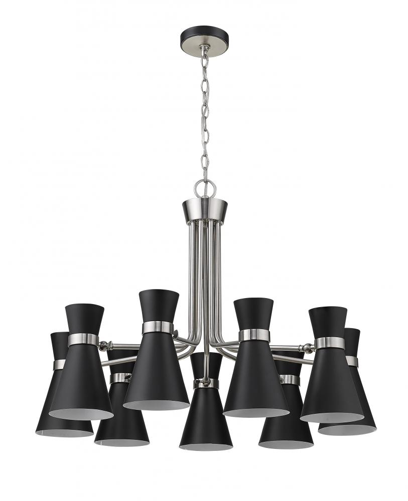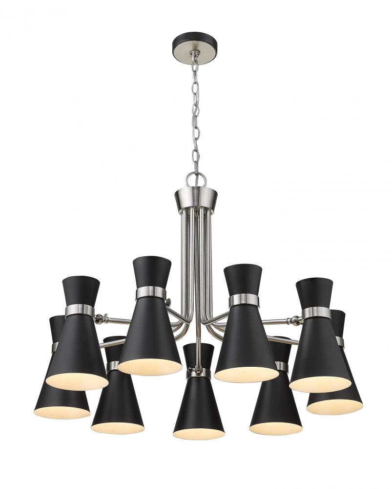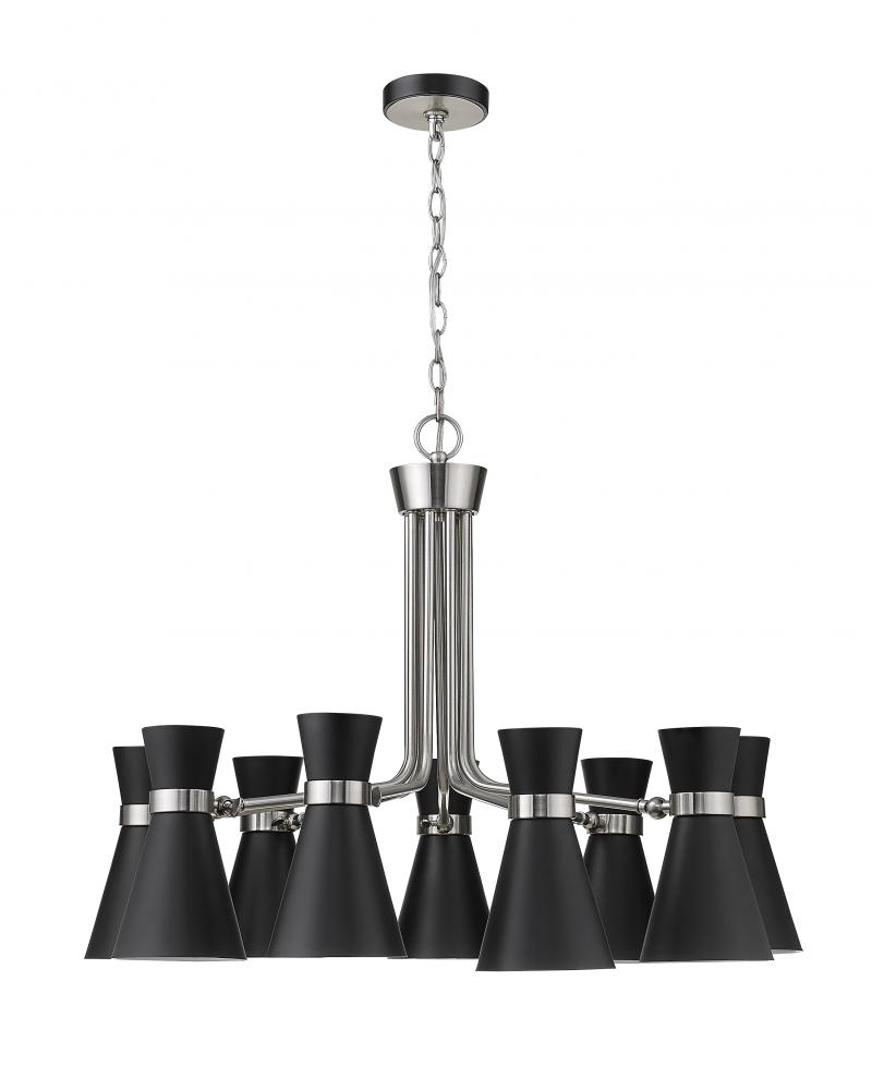 A decorative circular silhouette shapes industrial influence that adds casual elegance to this matte black finish steel nine-light island/billiard light. Dress up a dining or entertaining space with this tasteful fixture trimmed with brushed nickel finish steel. This sleek multi-light fixture reflects the heart of romantic industrial charm.