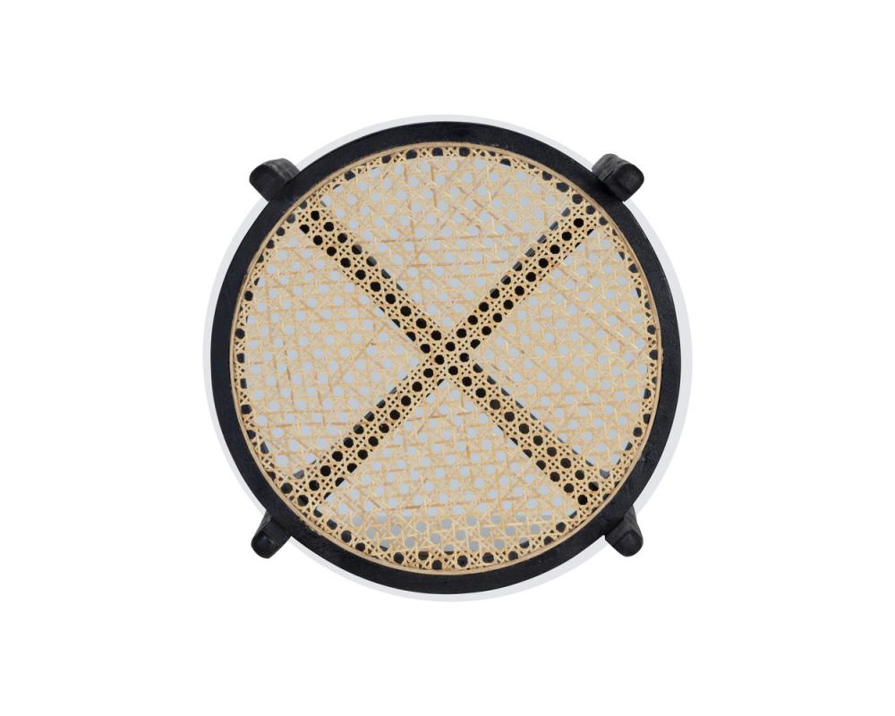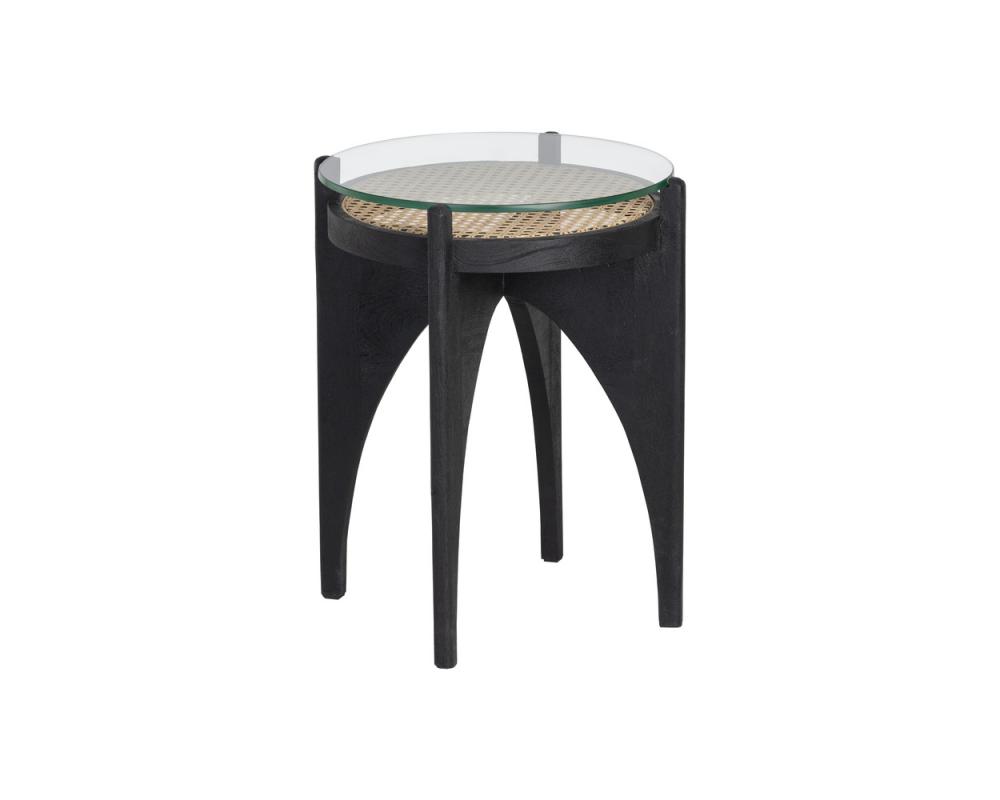 Inspired by global travels, this round end table combines old world influence with modern style. Features natural rattan top covered with clear glass and a sculpted black mango wood base. An intriguing design from all angles. Coordinating coffee table also available. Made in India. With refined craftsmanship, this design was brought to life by skilled local artisans. By nature, these materials develop unique imperfections such as fissures, markings and colour variations for a truly one-of-a-kind piece. Handle With Care: This design has been crafted with rattan. This artisan-crafted material features intricate weaving that results in natural variations where no two pieces are alike. Colour and texture differences are to be expected and embraced with this natural material. Due to the weaving process used, the fibres in this material may display shorter or longer lengths where the weaving ends.