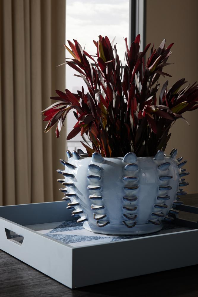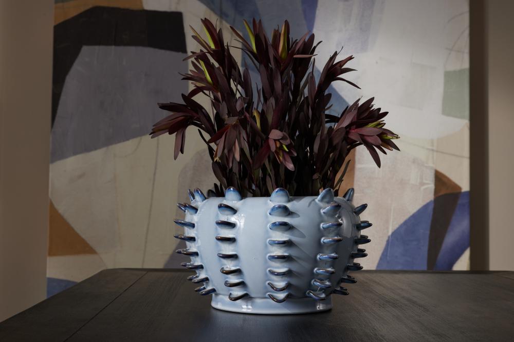 With a silhouette like a spiny sea urchin, a substantial porcelain vase is the perfect home for your favorite blooms. Finished with a marine-inspired glaze of reactive blue that moves from deep to shallow tones towards the edges of each textural accent. Finish will vary.