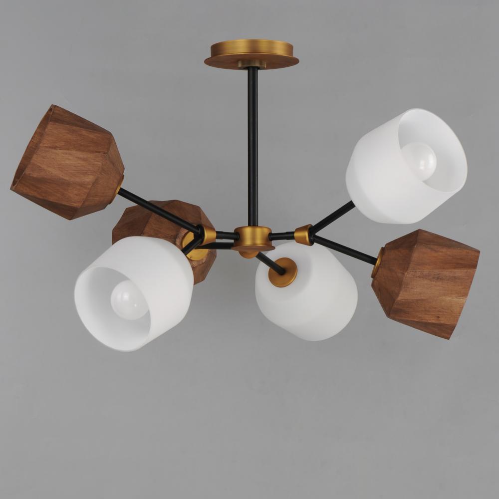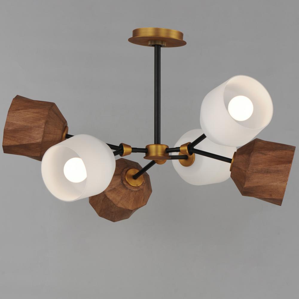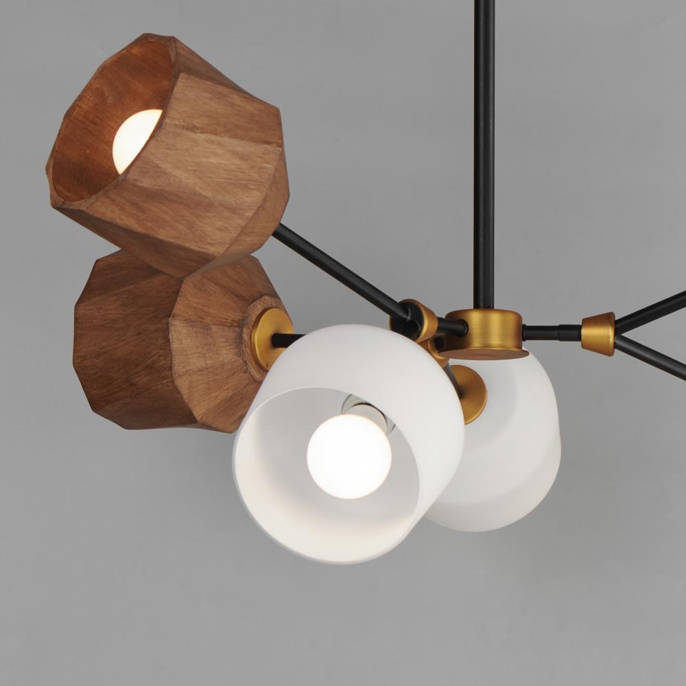 This stylish modern chandelier combines solid wood shades with warm bronze and brass tones for a striking, transitional look. Featuring arms akimbo, the design pairs walnut-stained oak with Satin White glass shades, offering a sophisticated blend of materi