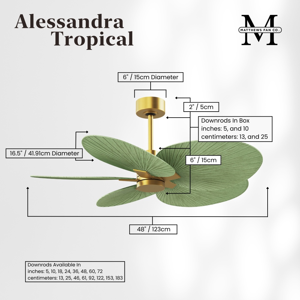 Minimal tropical form with maximum efficiency in 48". The thoughtfully crafted and versatile wet location Alessandra Tropical will complement any aesthetic and improve the health and comfort of any room. Highly customizable, the Alessandra Tropical is available in 5 different body finishes, 11 blade finish options and color changing light kit. Backed by a limited lifetime warranty, our fans are of the highest quality and will dutifully perform for years to come.