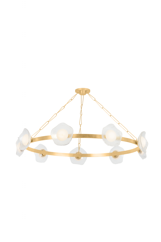 Combining organic and modern elements, Almandine is an elevated take on a traditional ring chandelier. The minimalist frame is accented with floral-shaped shades hand-cut from fluted piastre glass. Finished in Vintage Gold Leaf, the restrained metalwork allows the beauty of the blooms to shine. Almandine is available as a single-tier chandelier with 6 or 9 lights, a double-tier chandelier with 15 lights, and a single-light wall sconce.