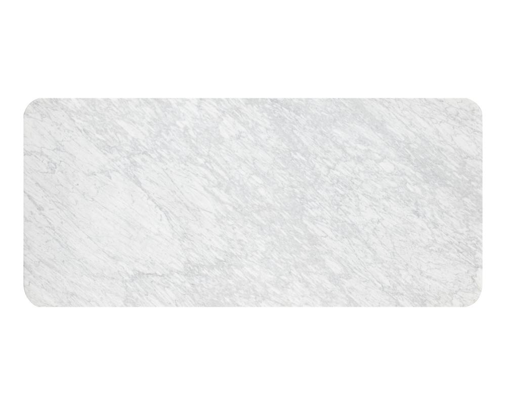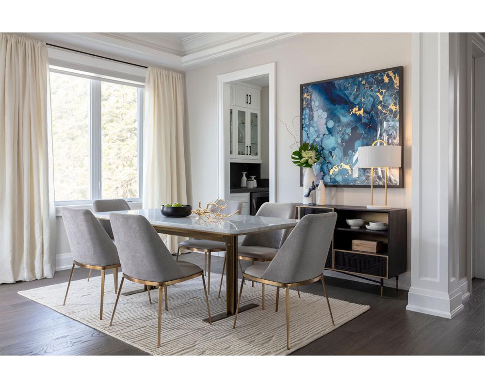This intriguing dining table will bring art deco styling to dining spaces. Crafted with a beautiful white marble top featuring rounded edges and a contemporary antique brass t-frame base. Seats up to six. As marble is a natural material, unique veining, pitting, fissures, micro-cracks and colour variations are all characteristics that add to the uniqueness and beauty of each piece.