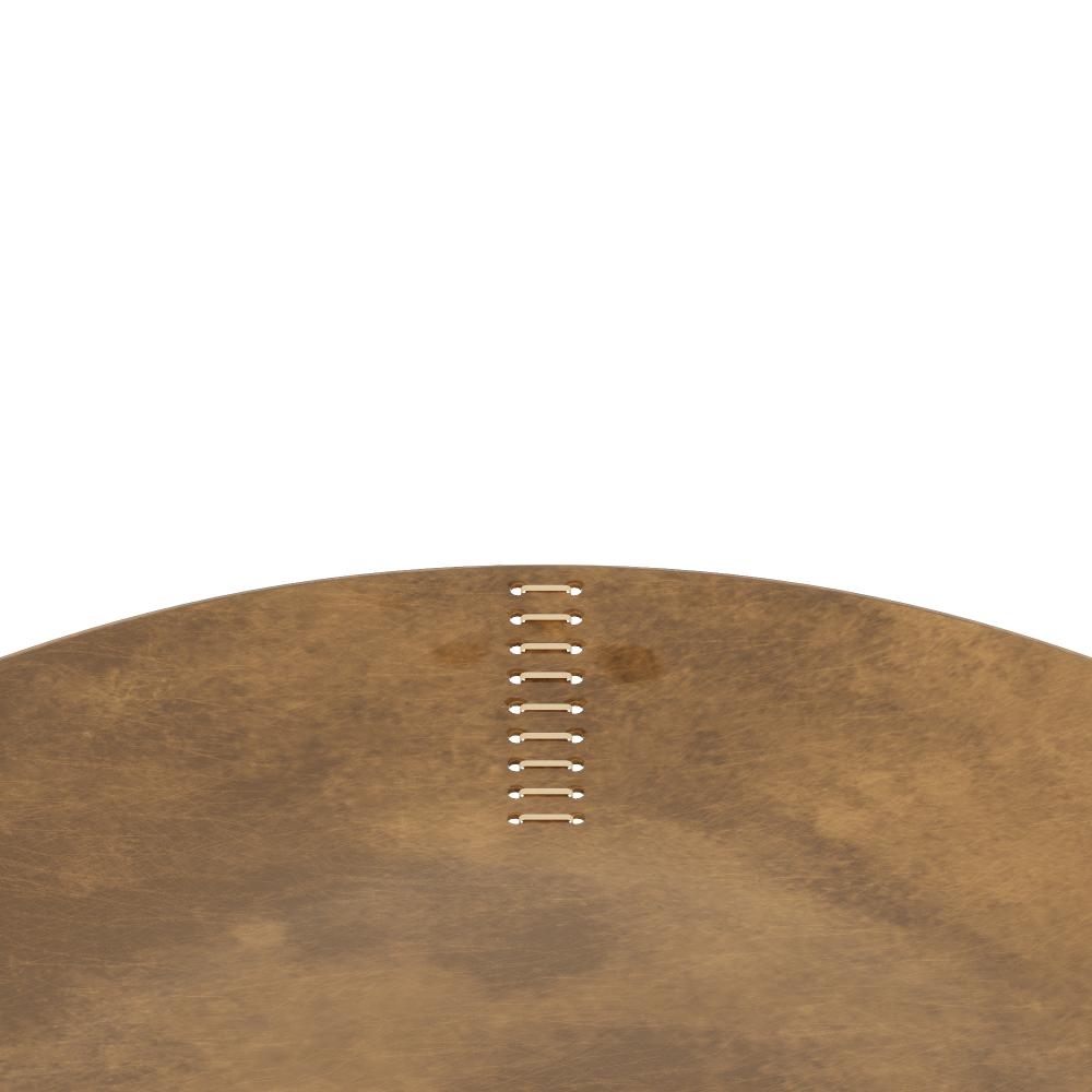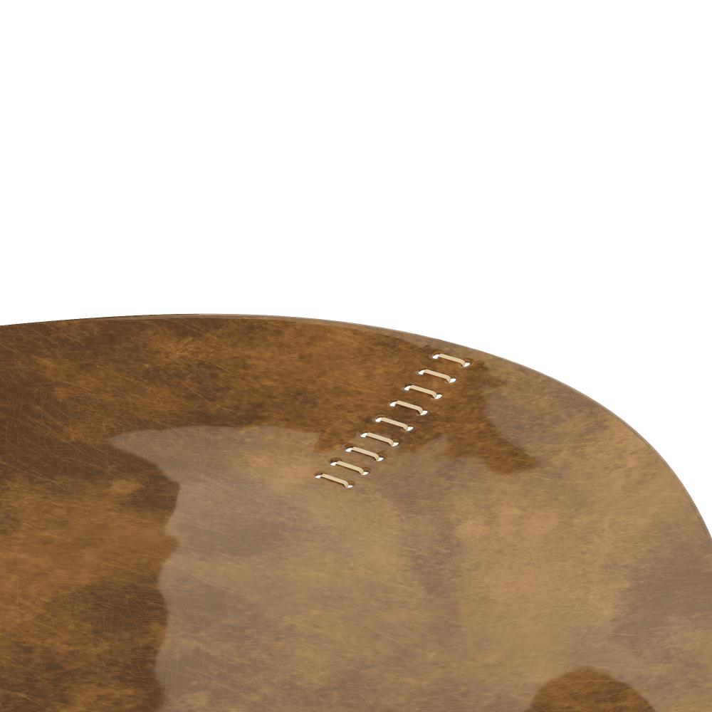 A freeform triangle tray finished in vintage brass is accented with natural rattan “stitching” at each corner for textural appeal. Inspired by leather valet trays, it makes a sophisticated receptable for every odd and end.