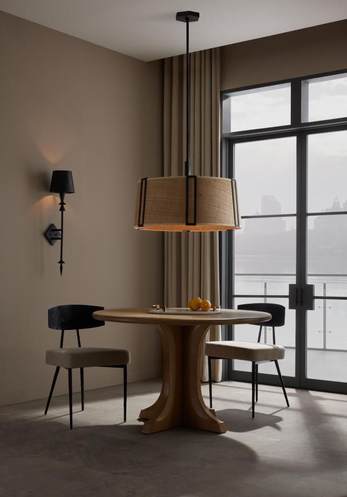 Traditional menswear accessories add a tailored twist to our classic pendant light finished in English bronze iron. A circular shade of natural grasscloth is cuffed with metal accents that recall of mid-century tie clips. Damp-rated, although limited covered outdoor conditions may affect finish. Finish will vary.