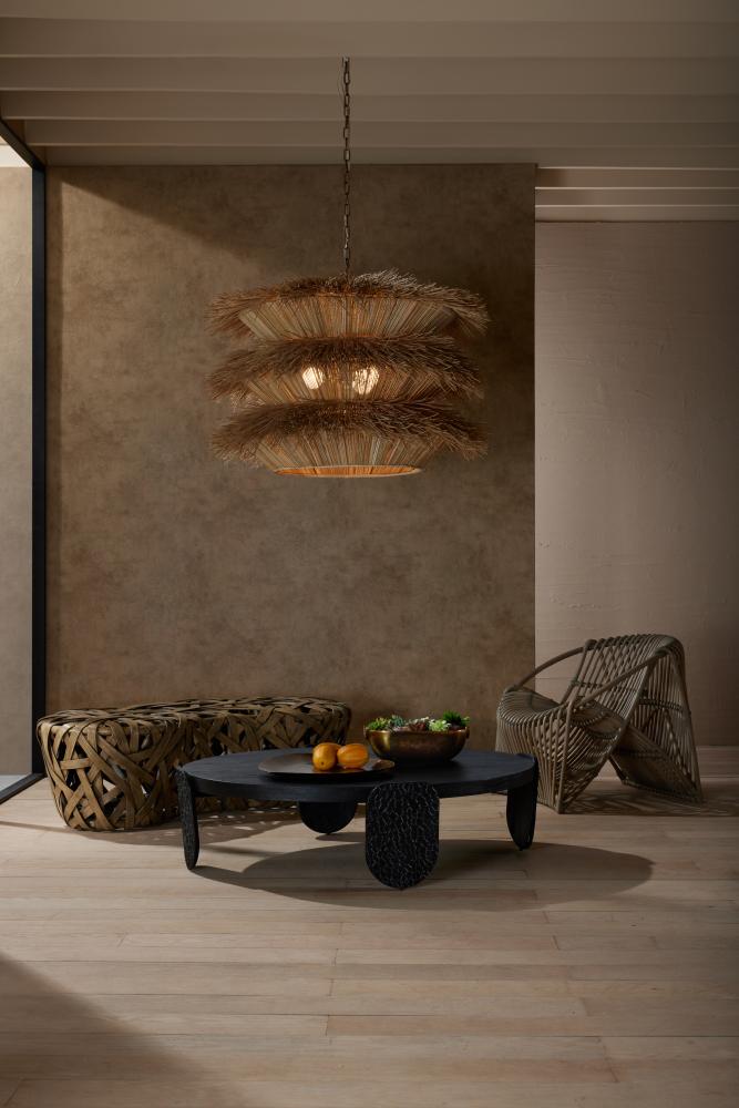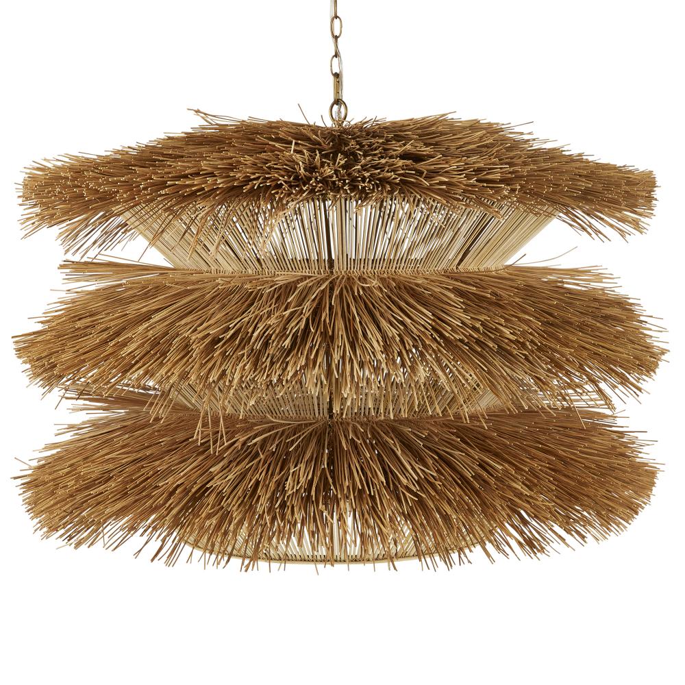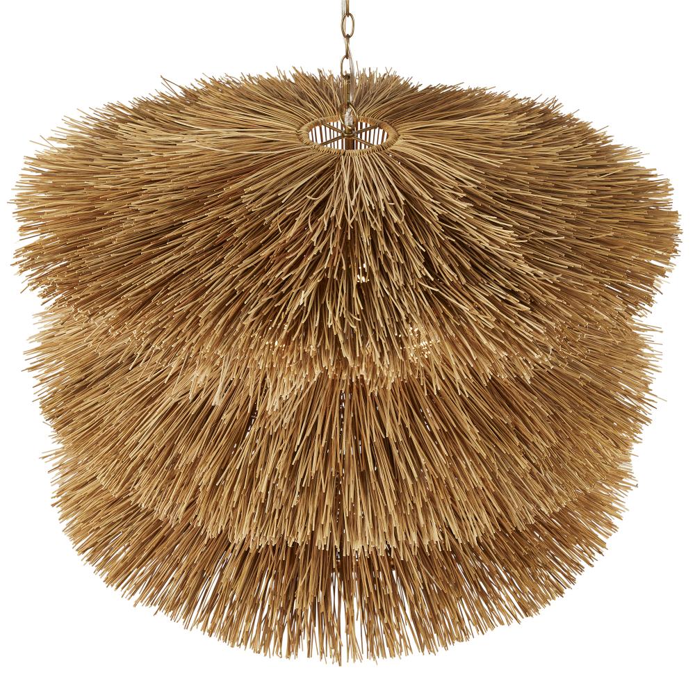 Three tiers of natural, sustainable rattan add a textural contrast to this architectural fixture. Anchored with an iron pipe finished in antique brass, it features three bulbs on an inside mount to deliver a unique glow throughout the fixture. Finish will vary.