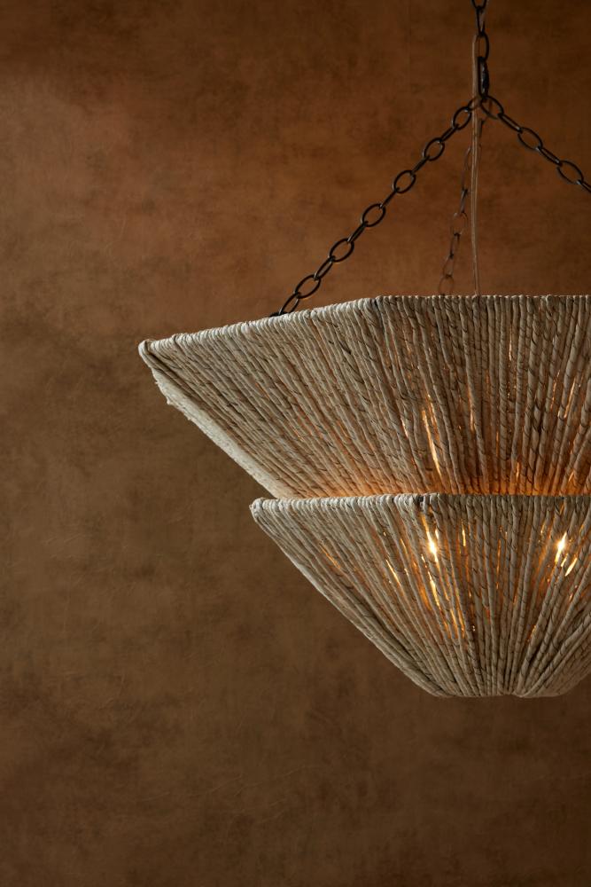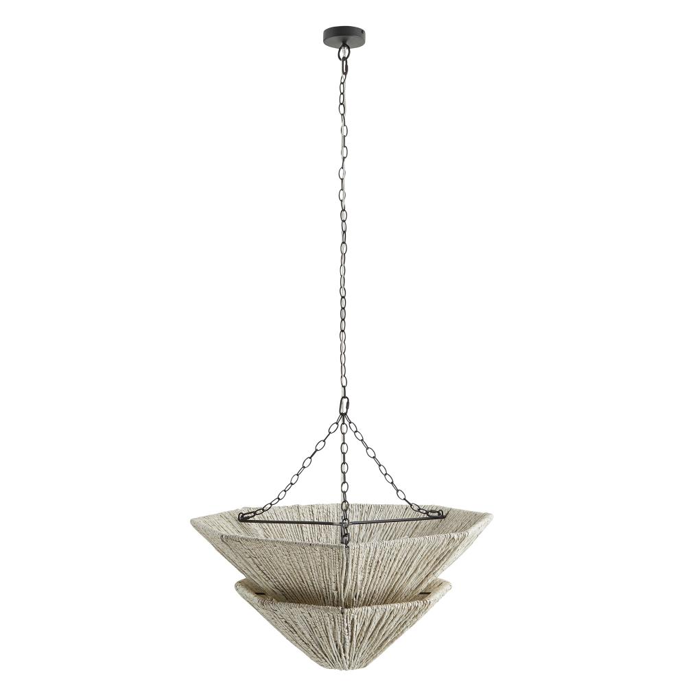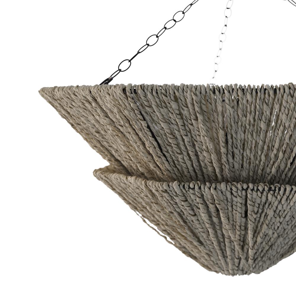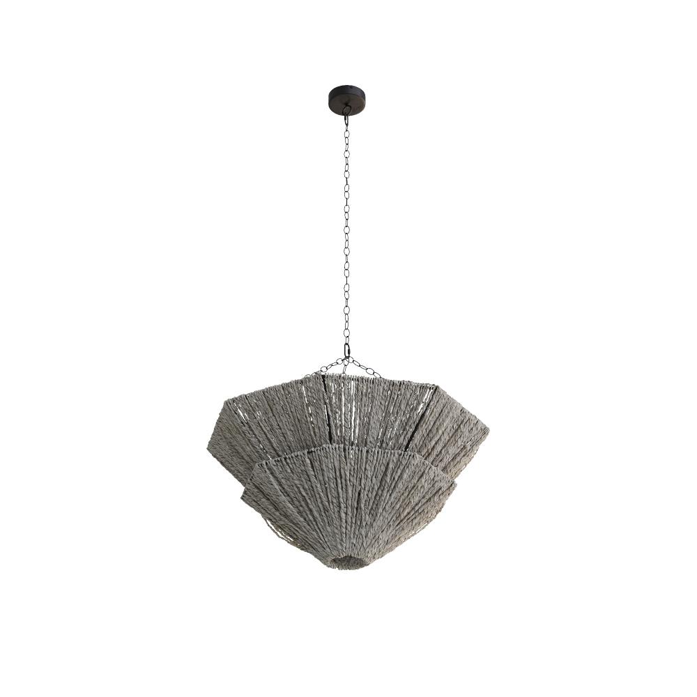 Two tiers of light gray stained sustainable abaca provide a soothing effect. Reminiscent of mountain peaks, its textural silhouette is designed to bounce light upward to flattering effect. Suspended from a trio of antique brass finished chains. Finish will vary.