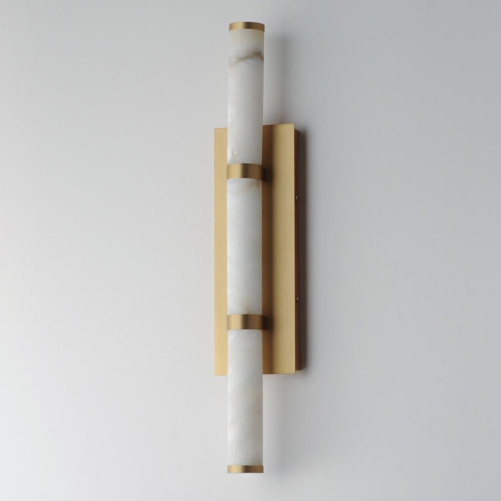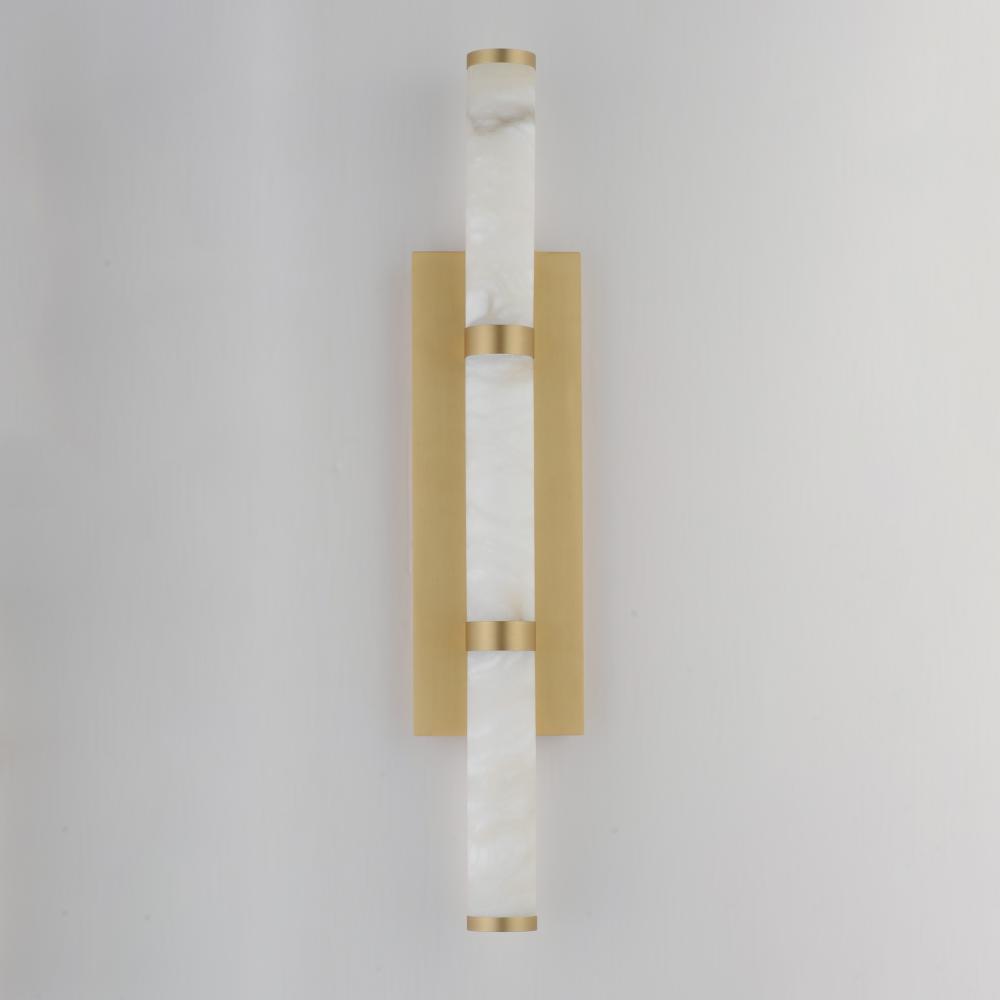 Featuring carved Spanish Alabaster shades in sleek cylindrical forms, the Aragon collection conceals high-powered LED light sources within, providing both beauty and functionality. The natural alabaster is elegantly complemented by plated Gold accents, add