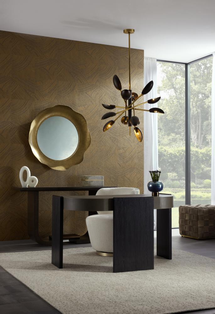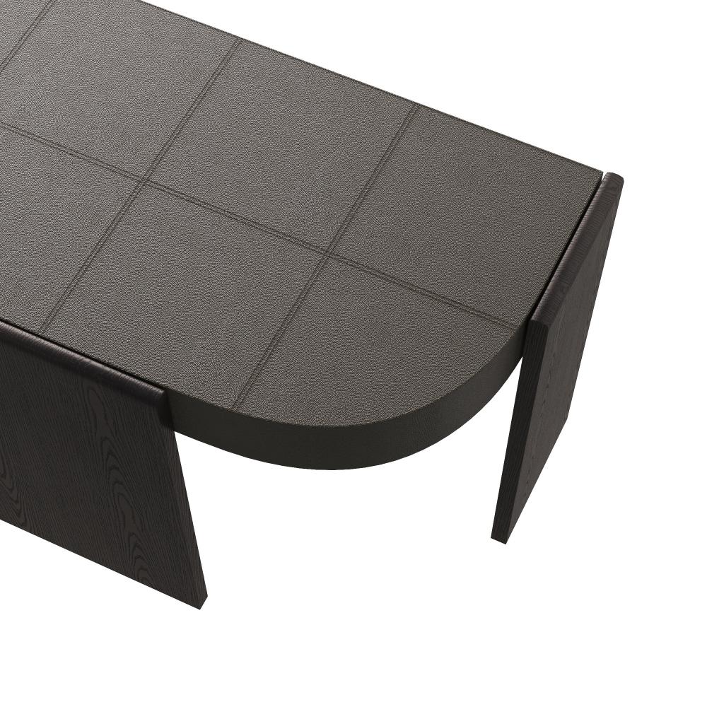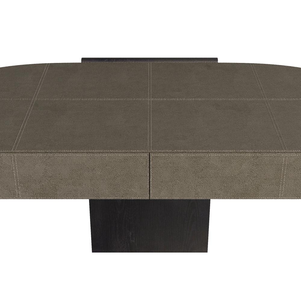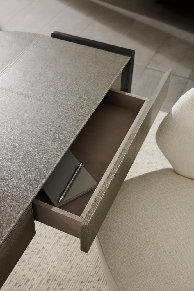 The modern workspace calls for a design with a simplistic profile and sculptural allure. A balanced half-circle of pebbled dove leather is held between a trio of ebony finished oak panels. Two suede-lined soft-close drawers hold all the essentials. Designed to be viewed from every angle.