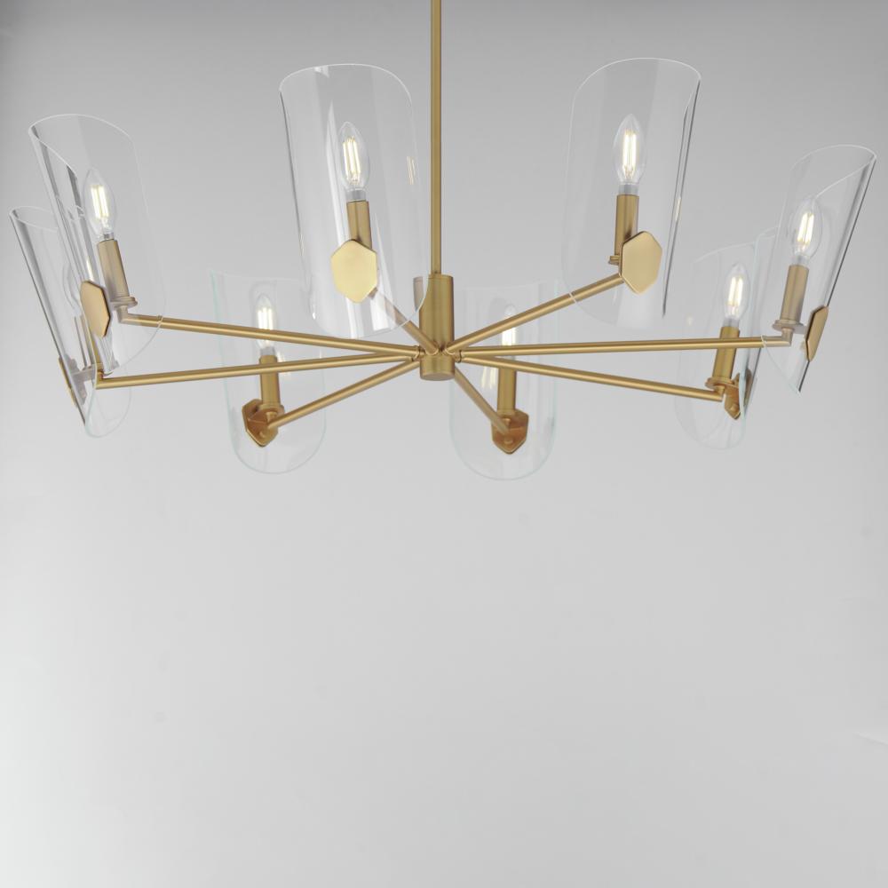 A Coat of Arms in curved Clear glass shades bevel cut and shaped to resemble traditional shields radiates off slender tubular arms. The streamlined design takes on a transitional approach with imaginative details that carries through to the concept for the