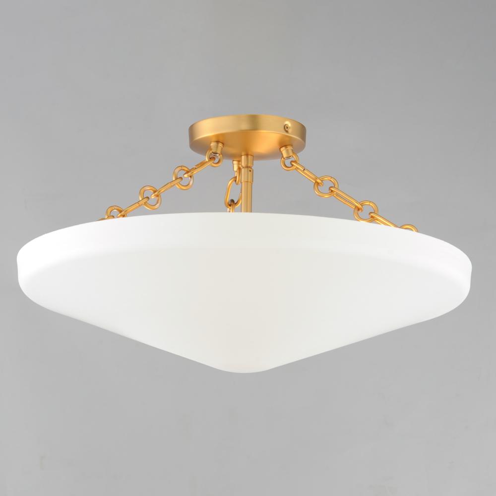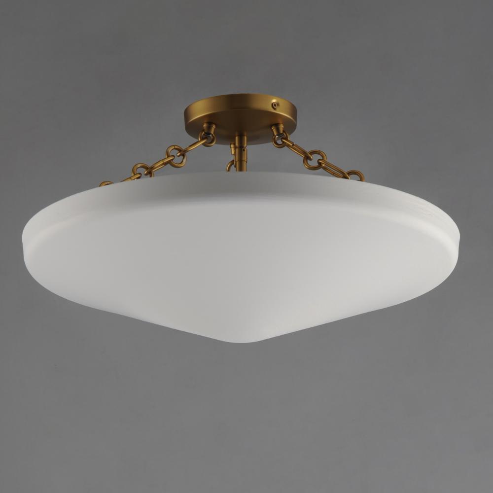 An inverted steel cone vessel painted in textured Plaster White gesso provides ambient lighting with classical styling. The stylized ring and oval chain links in Natural Aged Brass compliment the overall design. Available in two sizes of pendants and flush