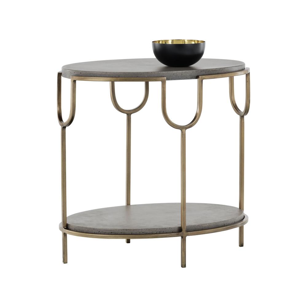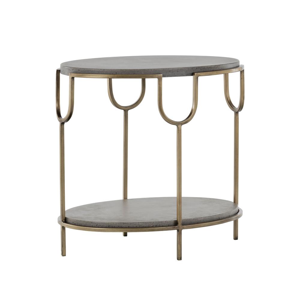 This oval shaped end table features a beautifully structured antique brass iron frame with a concrete top and shelf. A dramatic yet refined contemporary piece. Crafted from a natural concrete mix, each piece will look different, with variations of grey hues that will enhance over time.