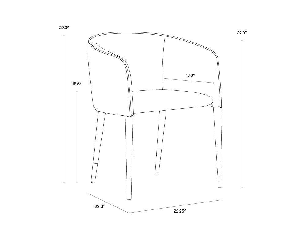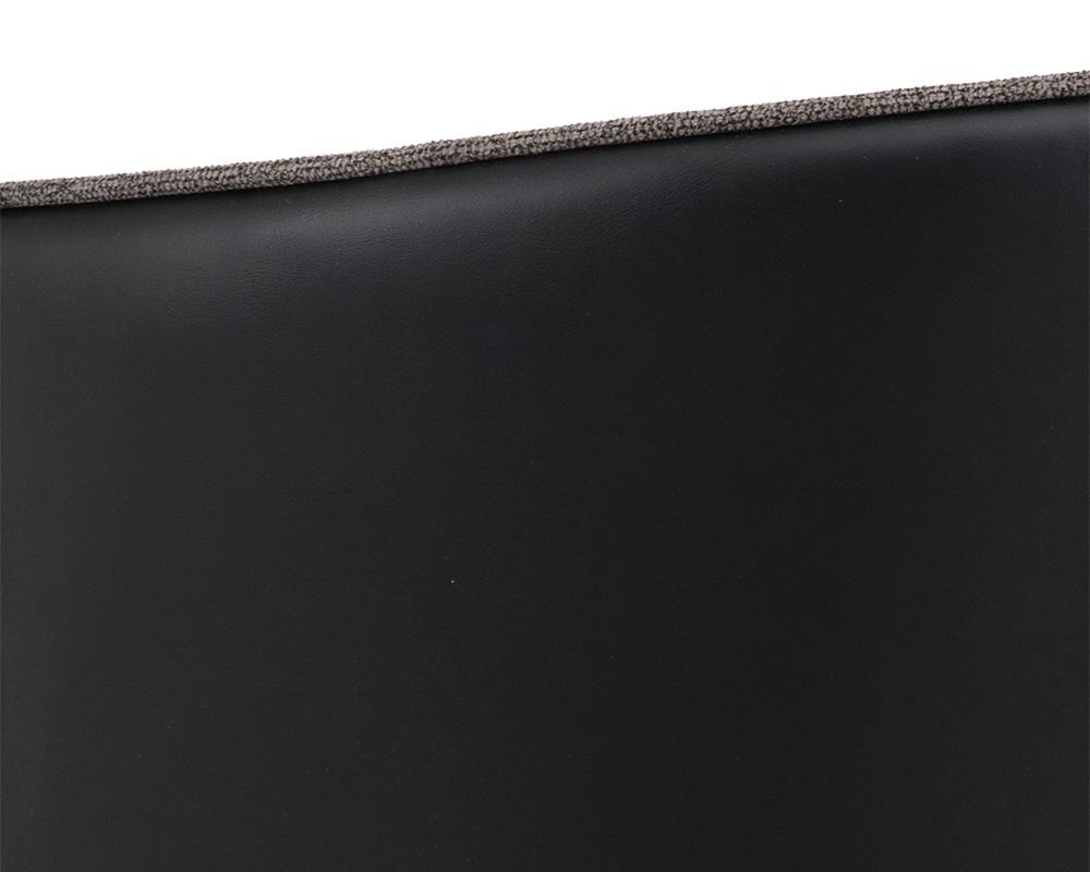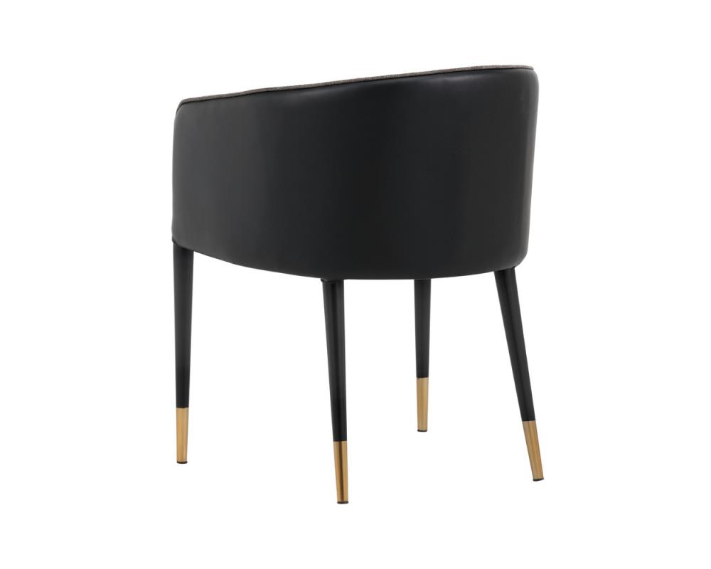 A modern barrel back dining armchair upholstered in our soft sparrow grey fabric and contrasting napa black faux leather. Finished with black steel legs and brushed gold foot caps. Handle With Care: This design has been crafted with faux leather. Faux leather is manufactured to reflect the natural characteristics of leather; as such, colour variations, markings wrinkles, grooves, and light scratches are appreciated characteristics. No two pieces will be alike.