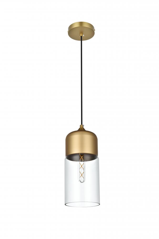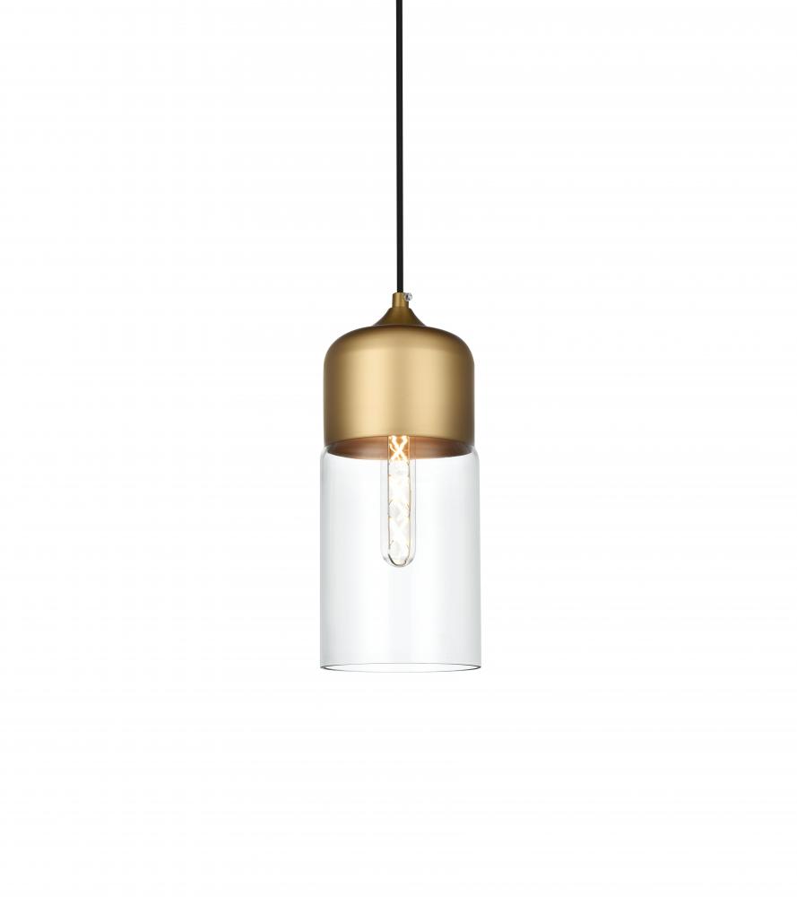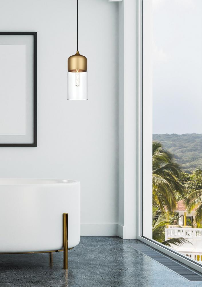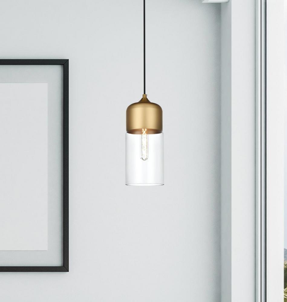 The perfect marriage of vintage charm and modern refinement, Ashwell pendant lamps blend well with decor from both Old World and New. A rounded iron frame in a satini gold finish comes with adjustable black hanging cord. The narrow cylindrical clear glass shade envelopes an E26 tubular filament bulb (not included) to complete the overall look. Ideal for a breakfast nook, kitchen, office, or studio.