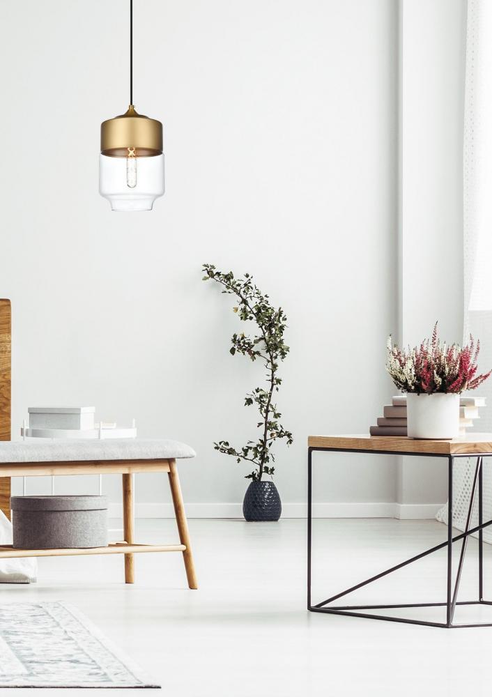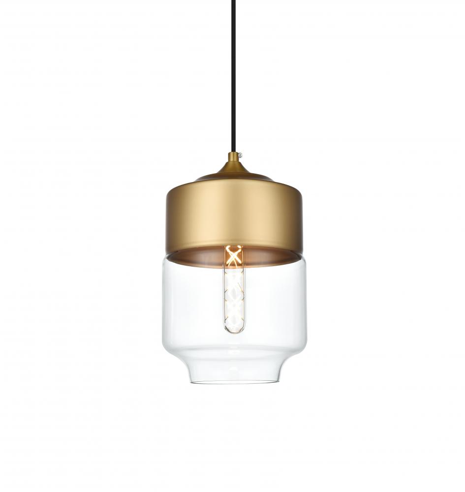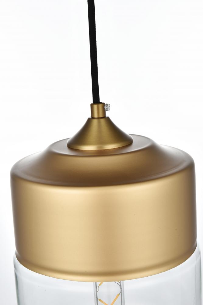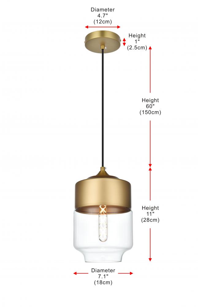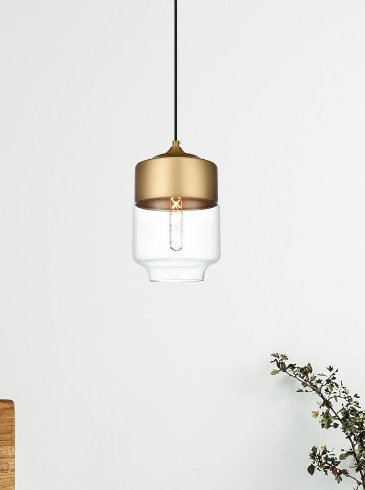 The perfect marriage of vintage charm and modern refinement, Ashwell pendant lamps blend well with decor from both Old World and New. A rounded iron frame in a satini gold finish comes with adjustable black hanging cord. The narrow cylindrical clear glass shade envelopes an E26 tubular filament bulb (not included) to complete the overall look. Ideal for a breakfast nook, kitchen, office, or studio.