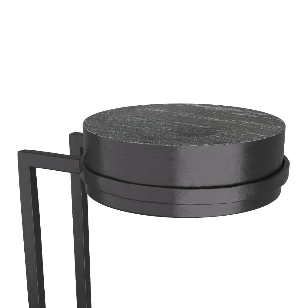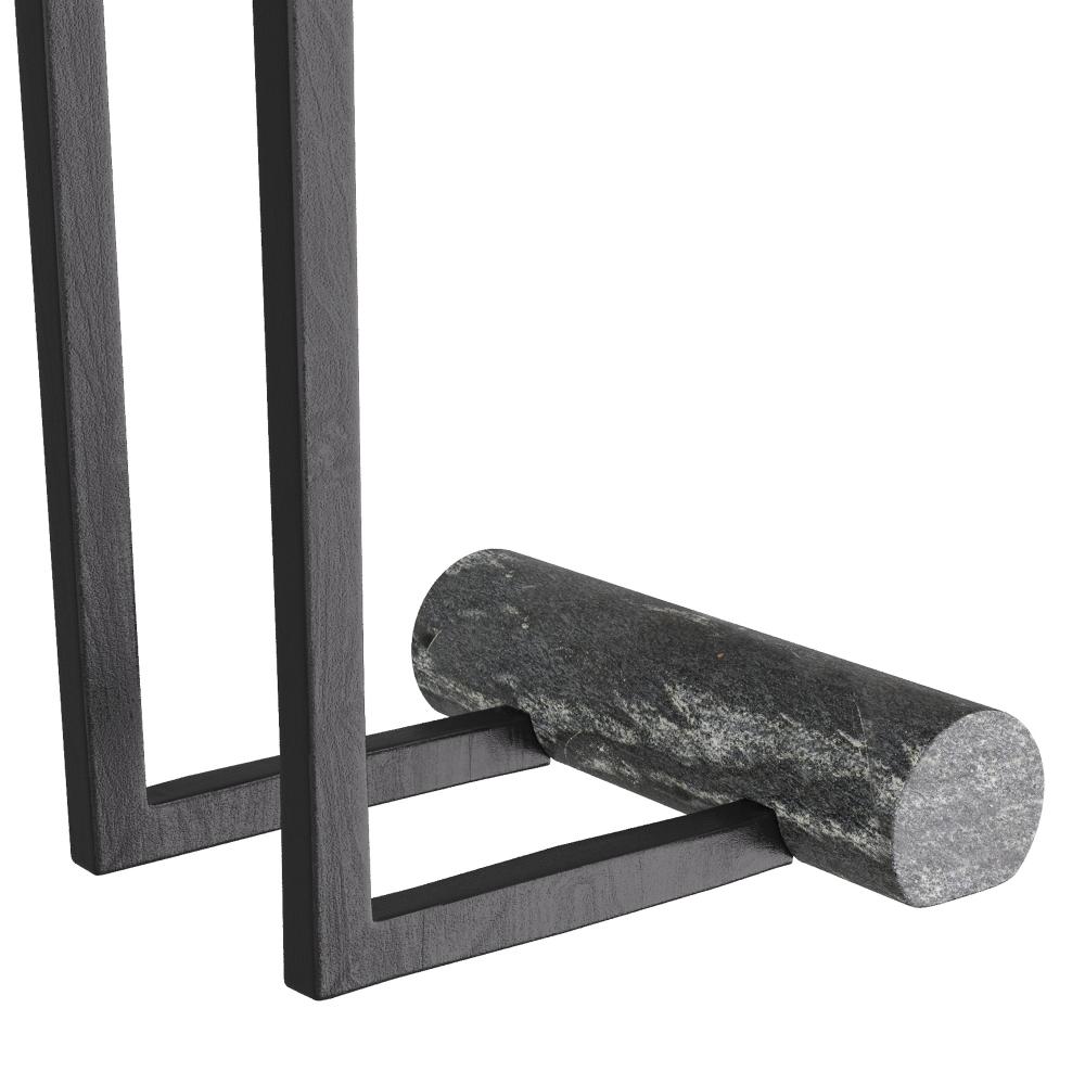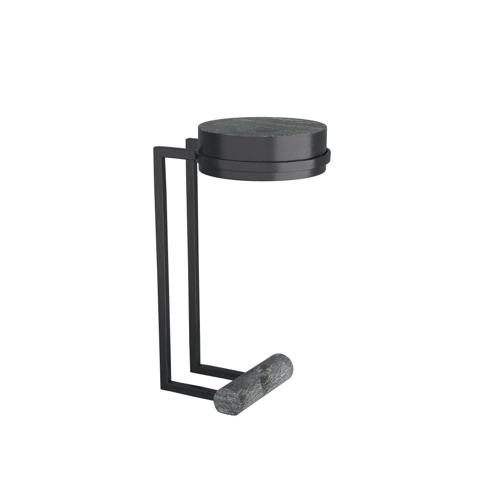 The playful silhouettes pioneered by the Memphis Design movement influence our essential Avalos. A round top of black marble cantilevers on blackened iron legs over a solid base of ebony-finished oak. Marble and wood will vary.