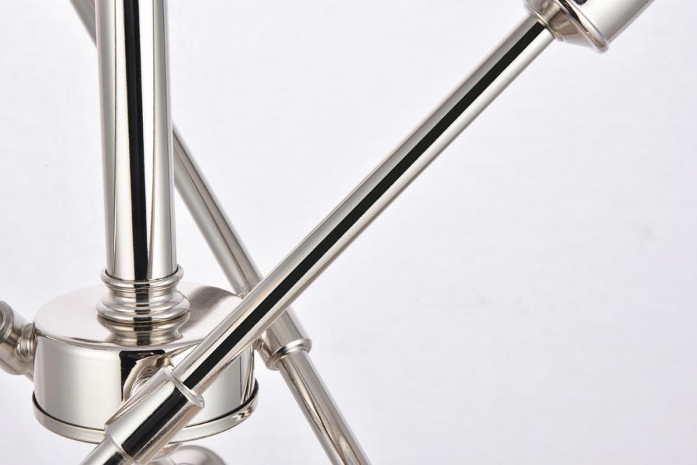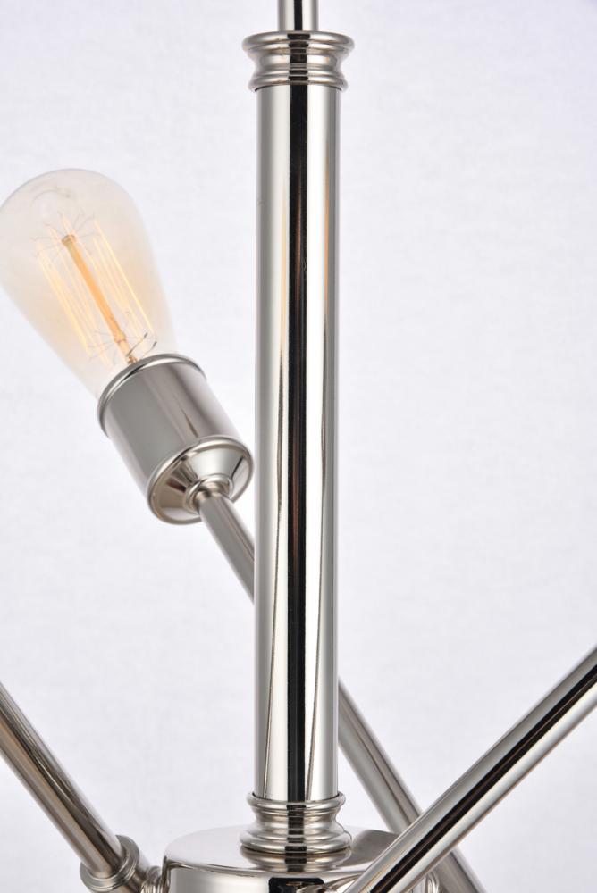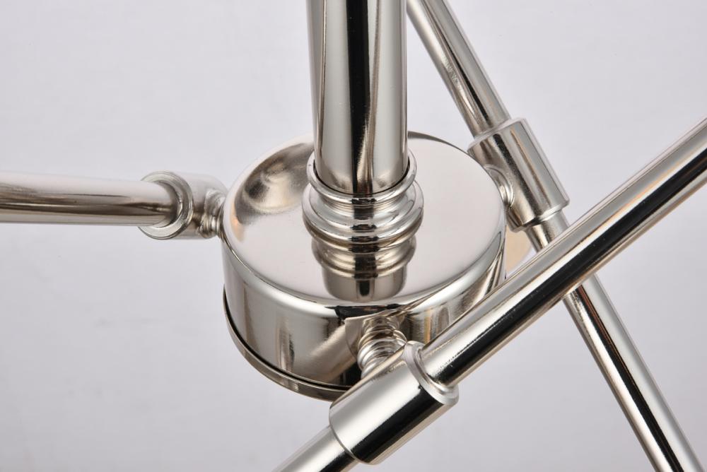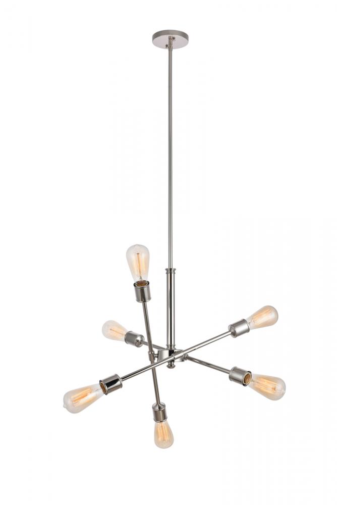 Modern sophistication with a jaunty presentation. This Axel pendant features three adjustable crossing arms mounted on a central rod to direct light in any direction. A total of six light sources (bulbs not included) in a compact design offers functional beauty in smaller spaces. The absence of shades says industrial; the design says penthouse. The smooth steel hardware is finished in reflective polished nickel, adding to the art deco flair. Stylish and cutting-edge without being too eccentric.