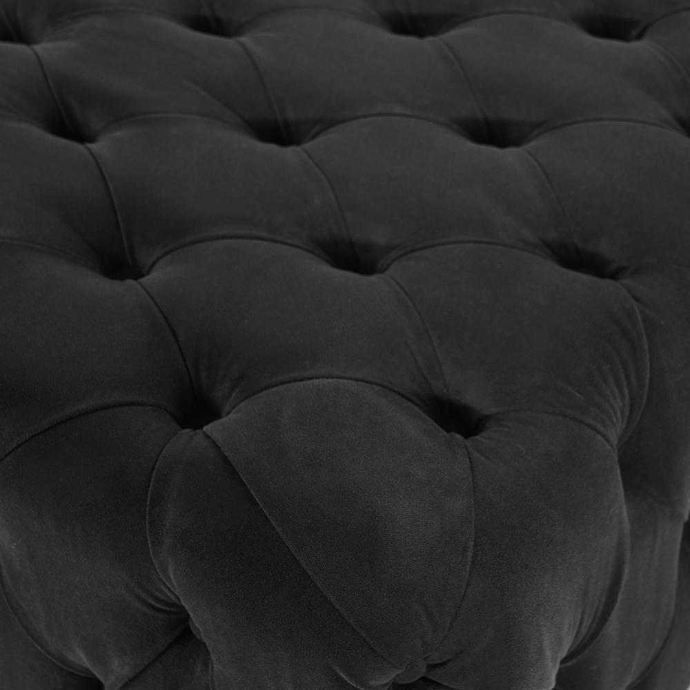This classic bench incorporates feminine form and flair. Designed with deep tufting in luxurious abbington black fabric and finished with a burnished brass steel base. Offers glamourous style as a coffee table or as extra seating.