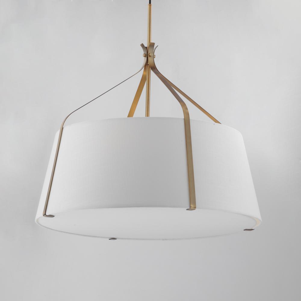 Inspired by timeless tailoring and architectural form, the Bandera collection reimagines the classic fabric shade pendant with refined, sculptural detail. A gracefully flared metal yoke suspends an elegant linen shade--offered in either Oatmeal with Dark B