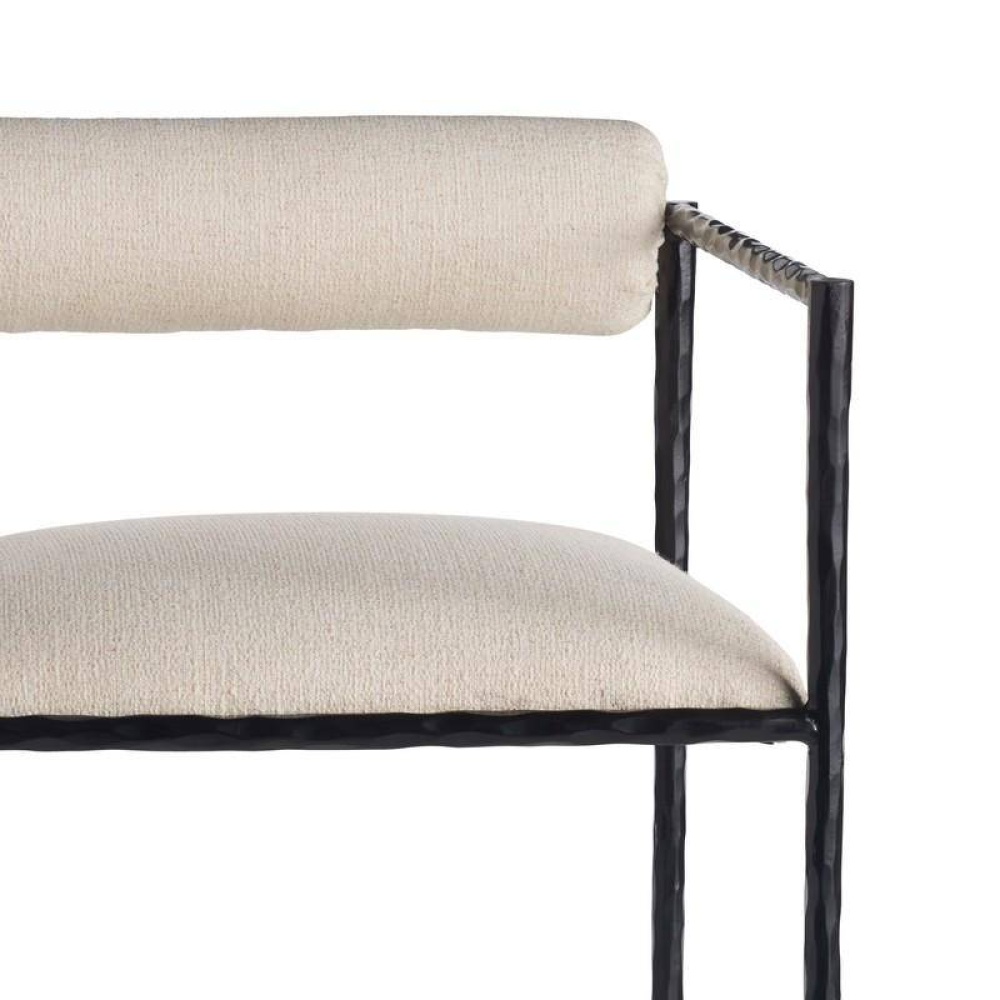 This exquisite bar stool is perfectly poised, perched on delicate legs recalling an insect. A body of natural iron is hand-forged to yield soft impressions along its sharp-angled frame. The tight seat and bolster back are covered in performance fabric in Oxford white. Finish will vary.