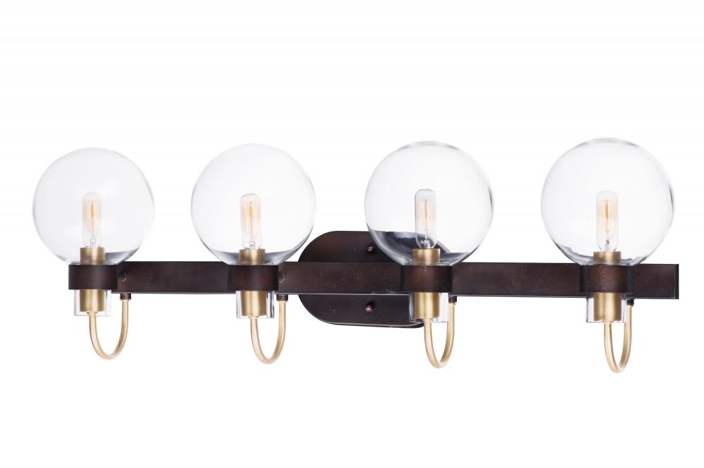 This classic Mid Century Modern design features a frame finished in a combination of Bronze and Satin Brass. The arms terminate at rings that support Clear heavy blown glass shades which were prevalent in this era.