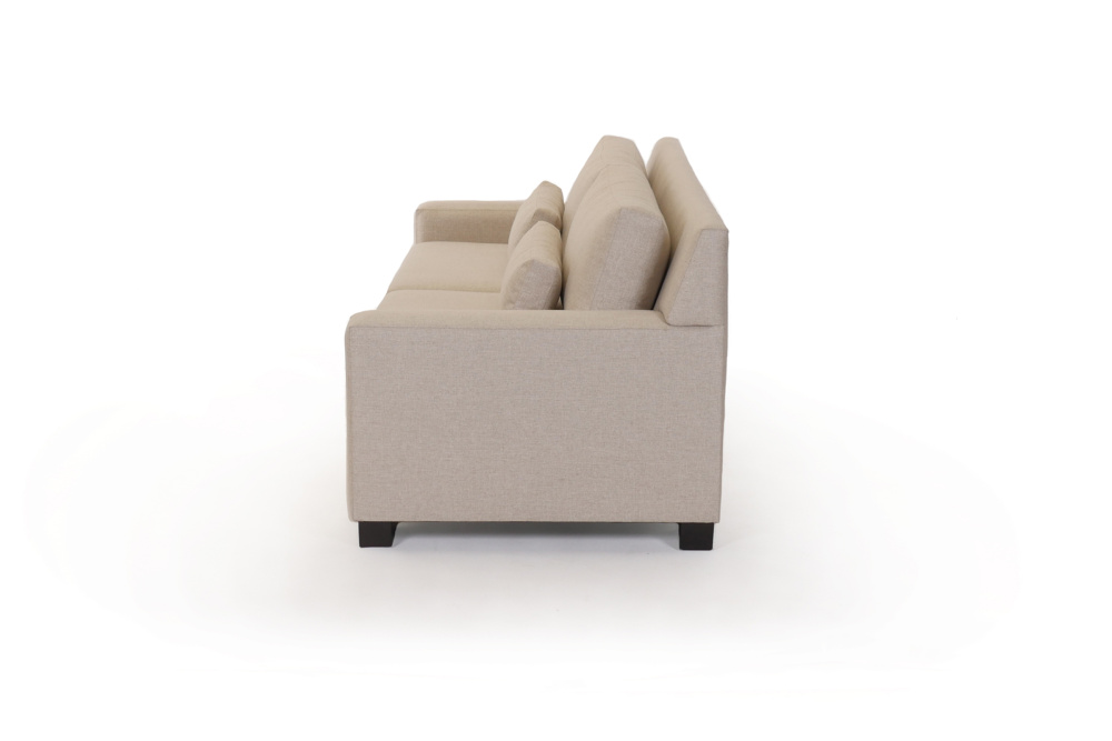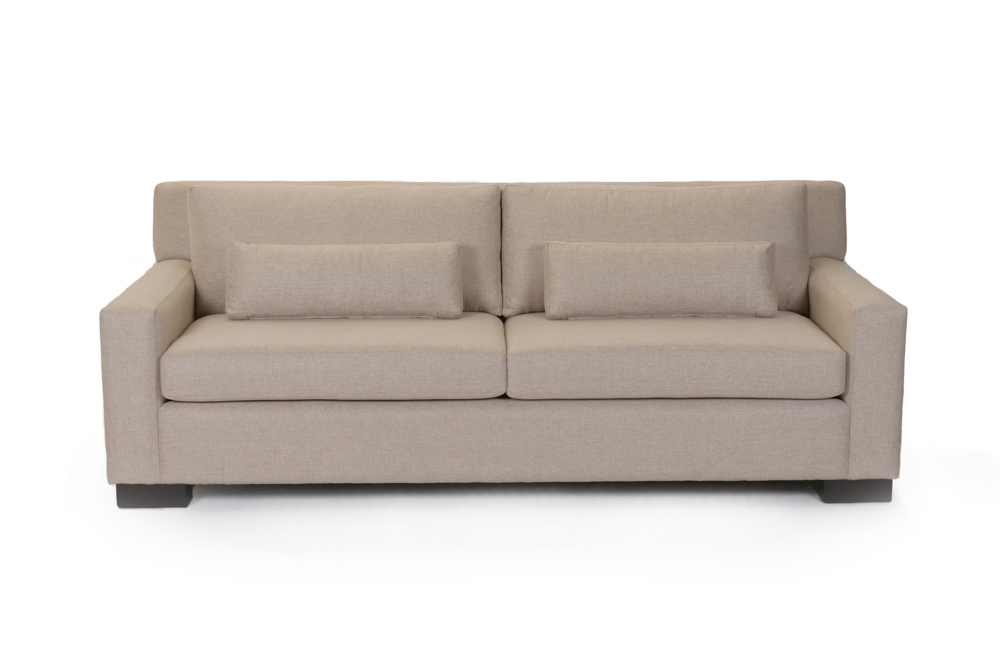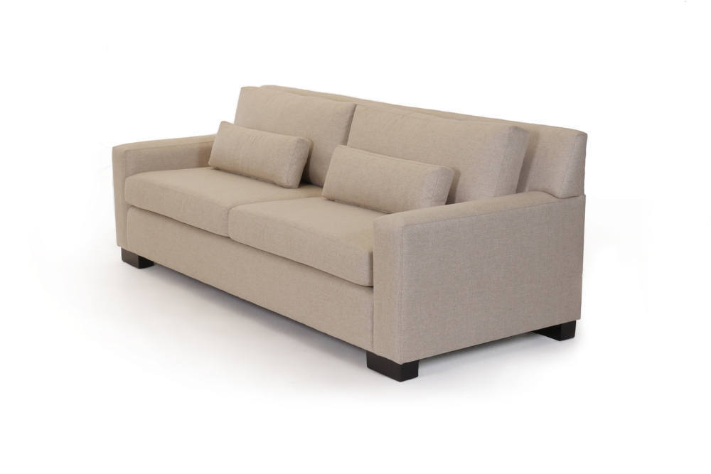 An edgy take on a track-arm sofa, with low boxed back cushions. This deep-seated sofa offers luxurious comfort on a large scale.