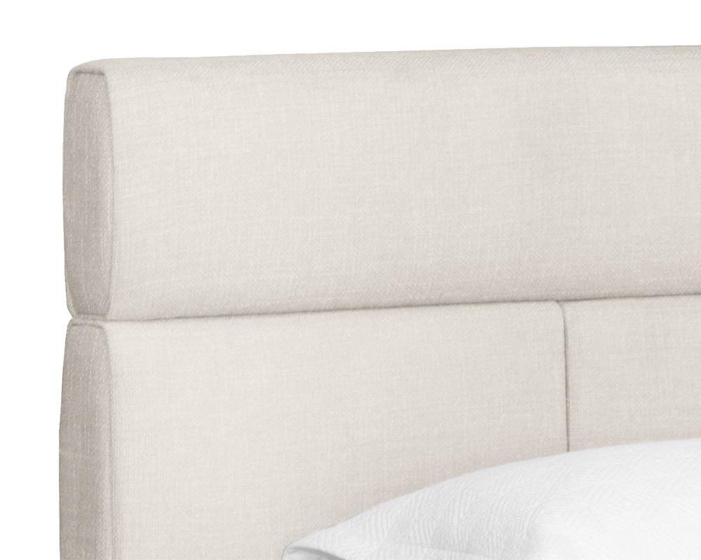 A stylish modern bed that features horizontal and vertical tufting on the headboard. Stocked in chacha cream fabric and complemented with a stainless steel base in an antique brass finish. No box spring is required and slats are included.