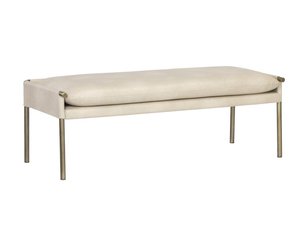 A beautiful upholstered bench from our Ikon collection crafted with an intriguing mixture of textures and materials. Features bravo cream faux leather seat with an antique brass frame. Also available in belfast grey fabric with a contrasting bravo ash faux leather or abbington black fabric with contrasting bravo black faux leather. Handle With Care: This design has been crafted with faux leather. Faux leather is manufactured to reflect the natural characteristics of leather; as such, colour variations, markings wrinkles, grooves, and light scratches are appreciated characteristics. No two pieces will be alike.