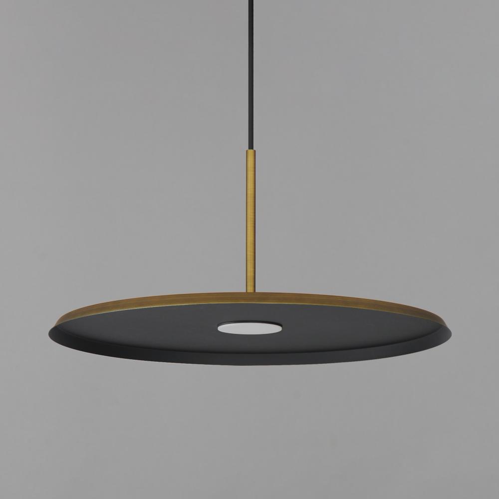 Wide flat discs house LED engines that disappear when viewed at the pendants edge. Supported at their center by thin tubes and black cable, machined aluminum housings feature laterally cut concentric circles drawing inspiration from the grooves in a vinyl