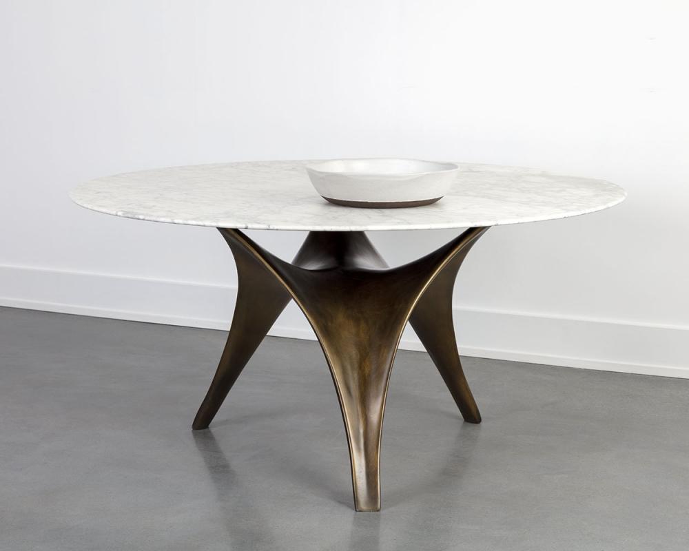 Make a statement with the Bijon Dining Table. Distinguished by its strong sculptural base made from antique bronze powder coated stainless steel. A matte white Carrara marble top adds a sense of intrigue to tie the piece together. As marble is a natural material, unique veining, pitting, fissures, micro-cracks and colour variations are all characteristics that add to the uniqueness and beauty of each piece.