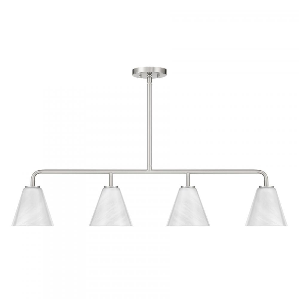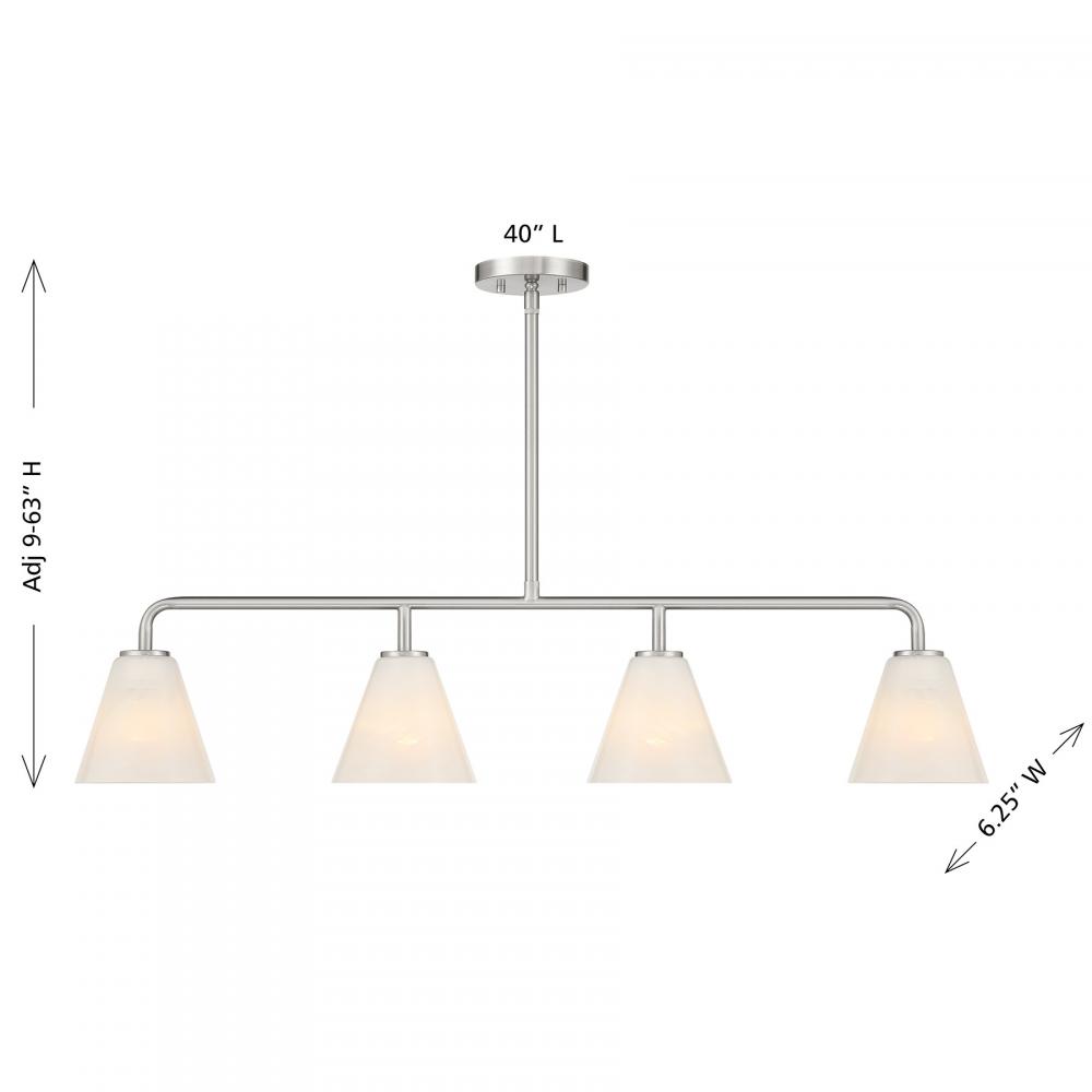 This Savoy House Blair 4-light linear chandelier is oh so versatile! It is finished in Satin Nickel and holds shades of spectacularly swirling strie glass. Blair is 40" in length, 6.25" in width and has an adjustable height ranging from 9" to 63". Uses four standard size bulbs of up to 60 watts per bulb. Bulbs not included. Comes with four 12" downrods and one 6" downrod.