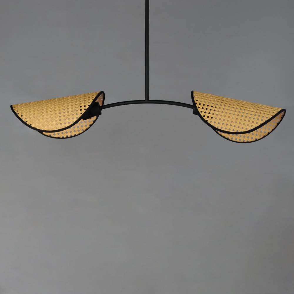 Natural cane woven wicker shades curve over exposed light bulbs like the brim of a bonnet on a minimalistic mobile chandelier. The composition of shade and chandelier shape are of a corresponding curvature. The contrast of natural materials and sandy Black