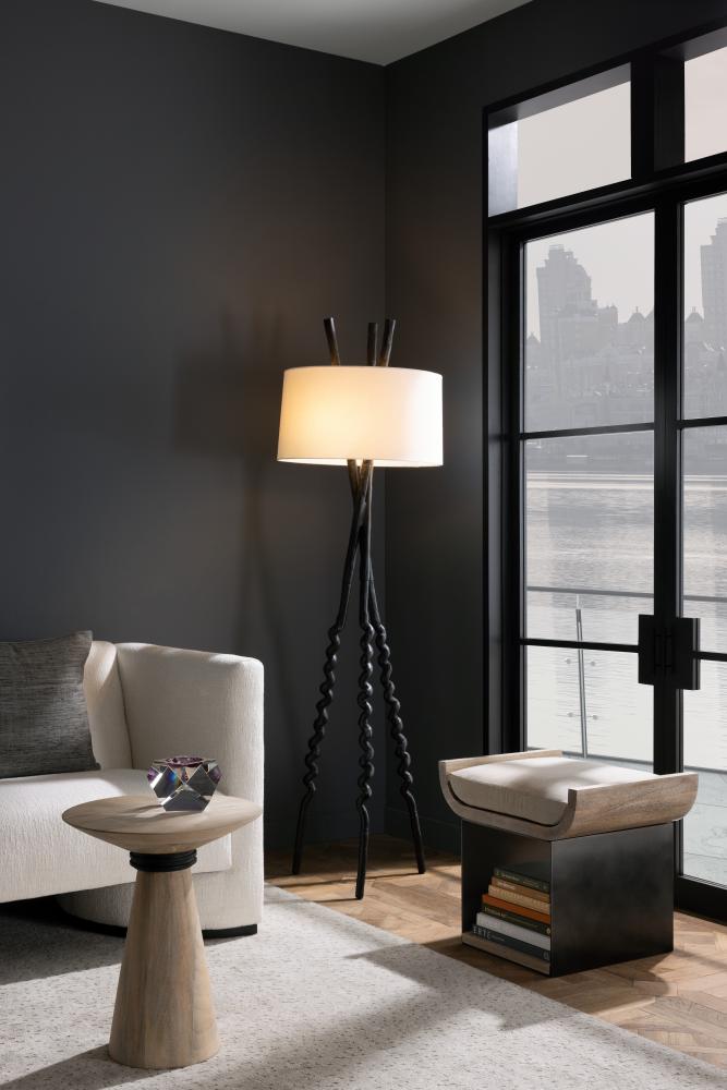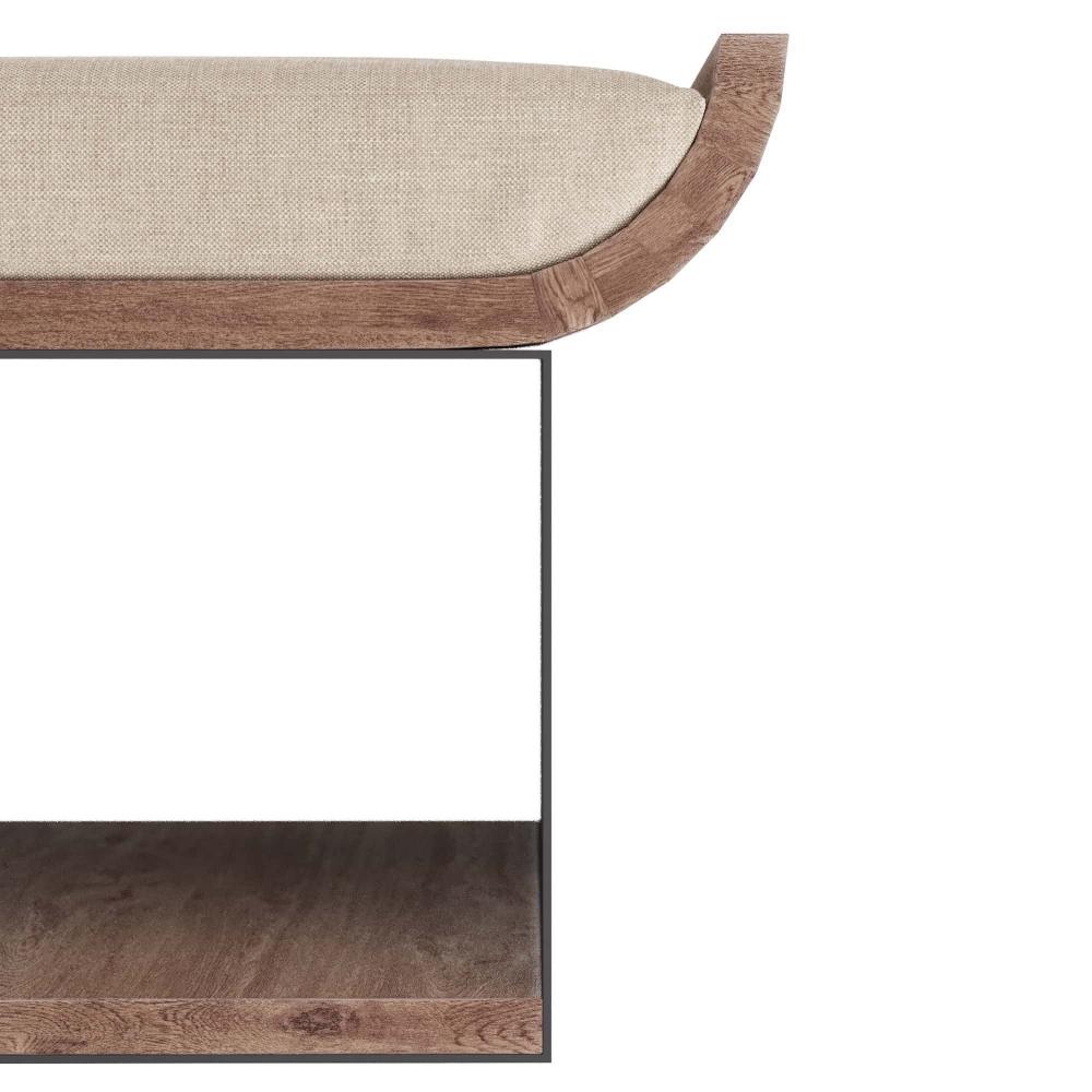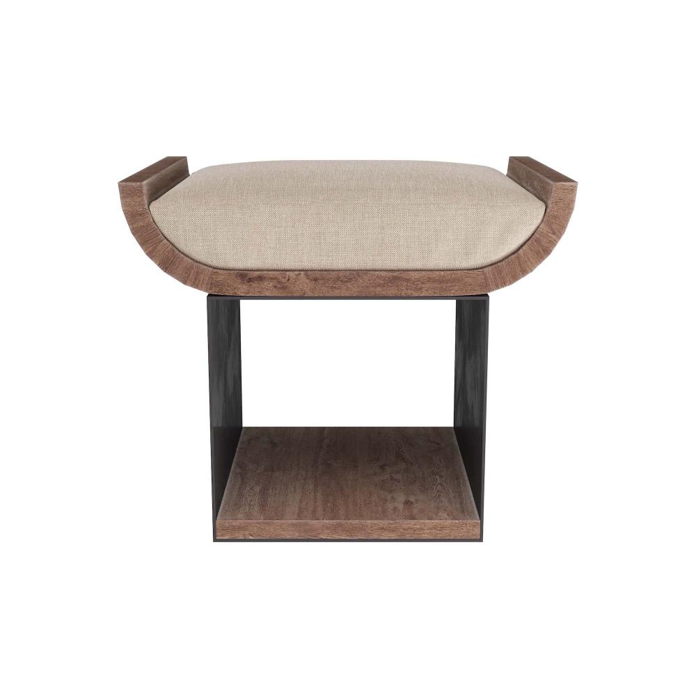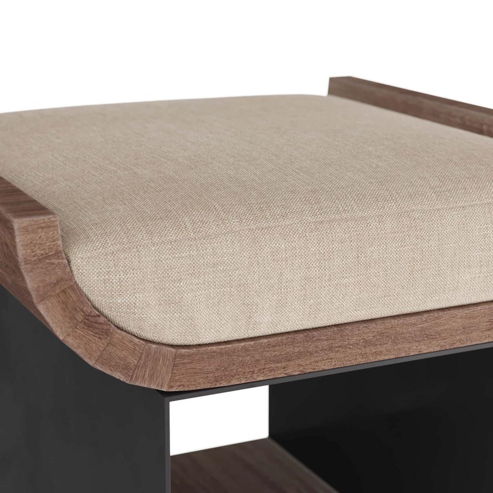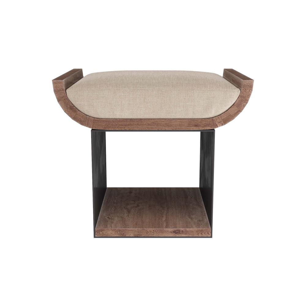 STACK LARGE ART OR COFFEE TABLE BOOKS HORIZONTALLY IN THE WELL OF THE WHITEWASHED WOOD AND GUNMETAL IRON STOOL. FITTED WITH A NATURAL LINEN CUSHION TO USE AS A SEAT AROUND COCKTAIL TABLES, FIRESIDE, OR NEAR BOOKCASES AS A STEP TO REACH HIGHER SHELVES. FINISH WILL VARY