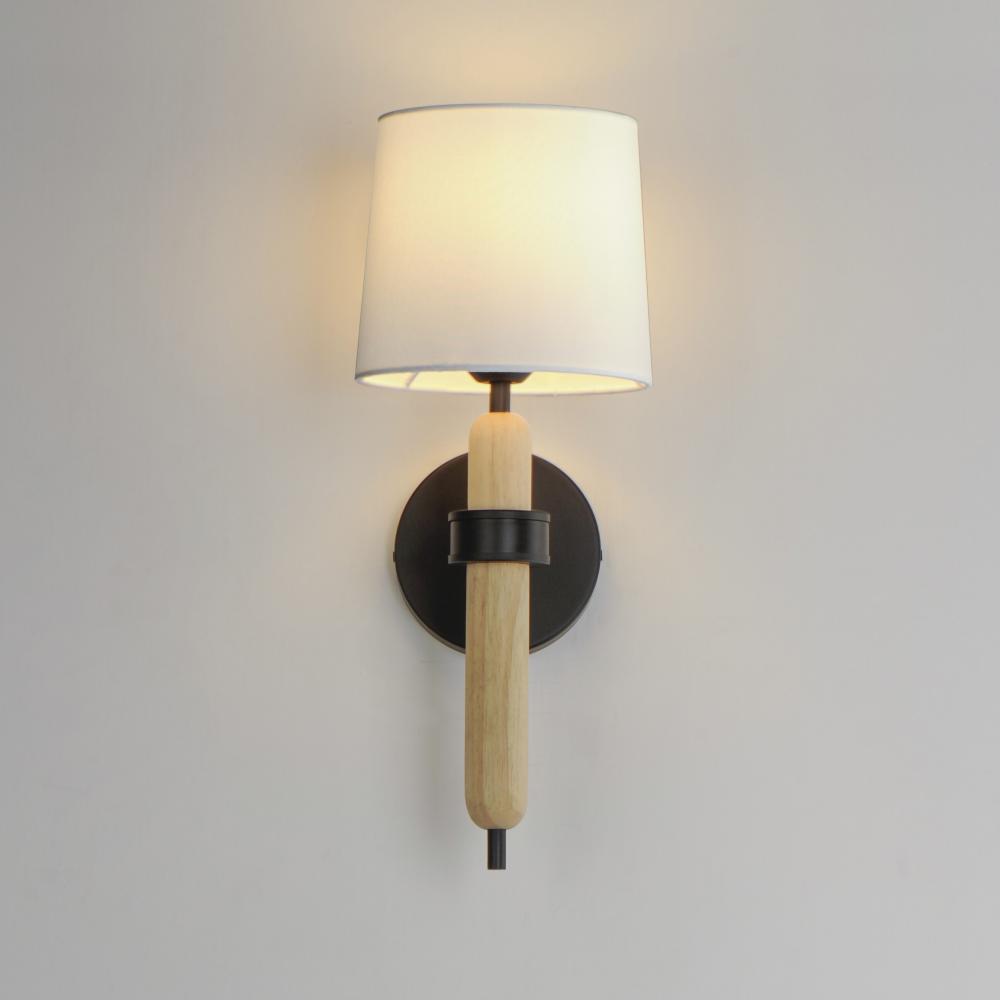 Natural White Oak wood details are featured plainly on a slim Matte Black metal frame. Oversized off-white linen shades cover sockets for a minimalist and natural look. Available in multiple configurations of chandelier and a wall sconce.