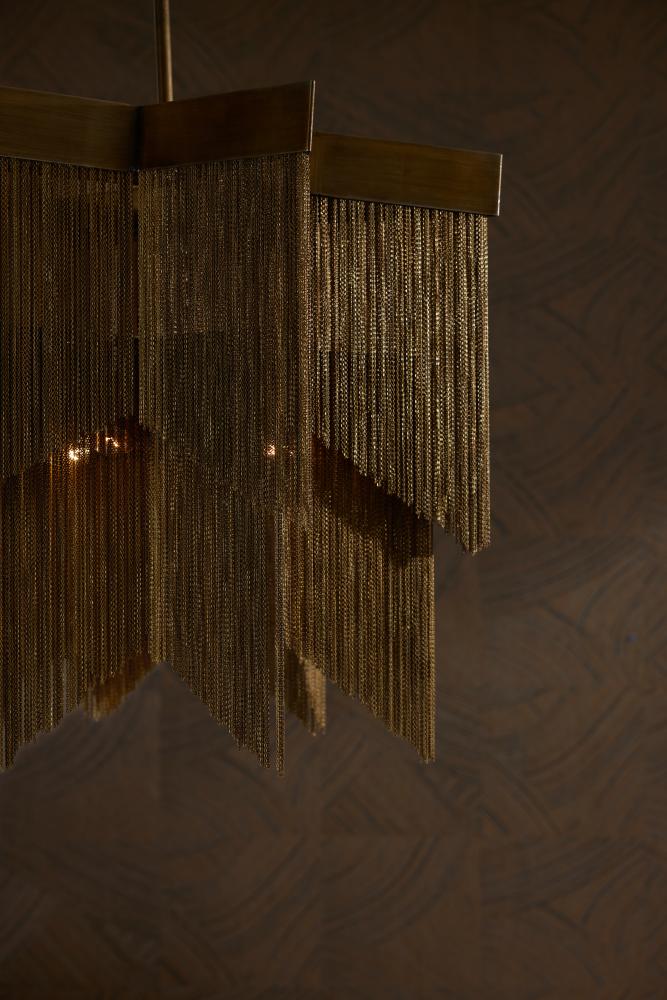 When the elegance of Hollywood Regency meets sophisticated design of today, the result is nothing less than spectacular. The Deco-inspired fixture features a star shaped staggered of chains of vintage brass iron in double tiers for extra drama. Even the celestial-shaped frame has an effortless star quality. Damp-rated, although limited covered outdoor conditions may affect finish. Finish will vary.