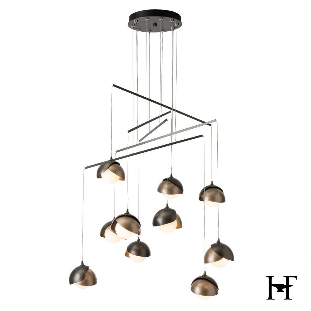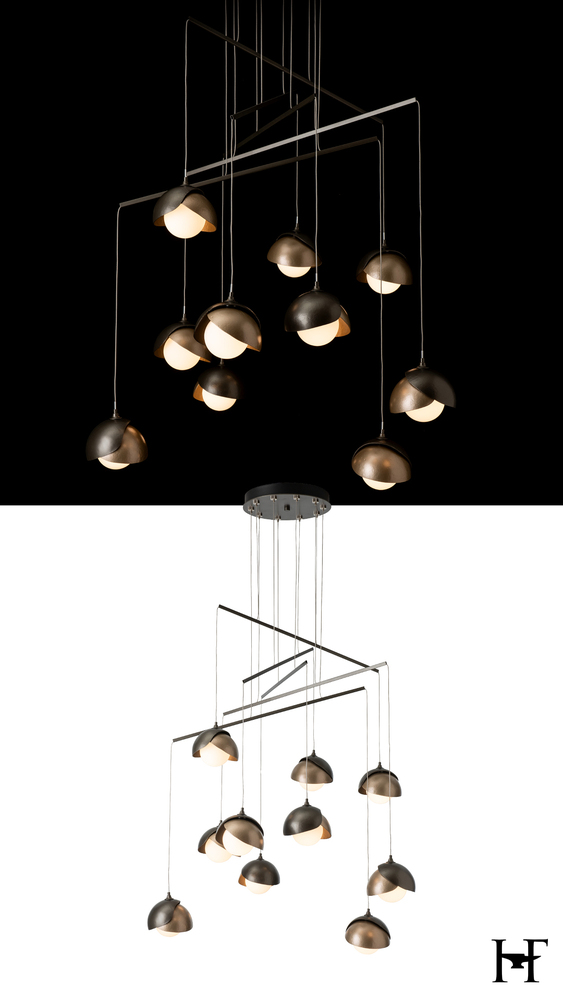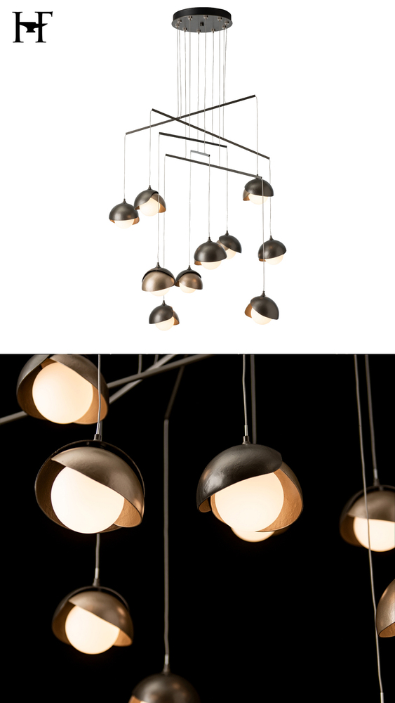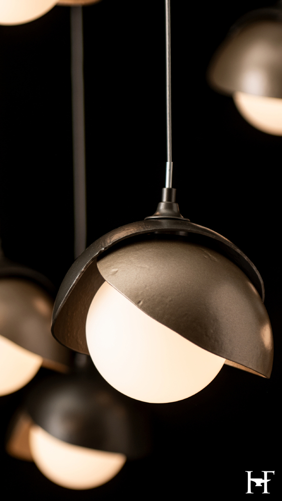 Hand-forged shades shield each light of the Brooklyn Double Shade Mobile. With its mobile platform, the Brooklyn's canopy is minimized and its reach is maximized. Delicate metal tubes guide cables for a highly-adjustable configuration. The shades are available as a two-tone option, with shades that can be in contrasting finishes, if desired. Vermont artisans hand-forge and texture each shade for a distinctive look.