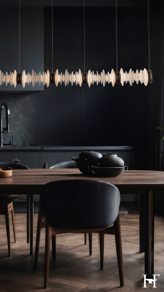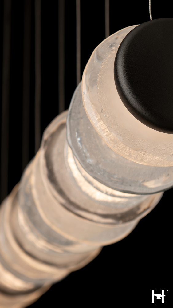 An addition to the Cairn Collection, this pendant tips the vertical glass "stone" stacks to a horizontal in this wonderful linear version. Round, textured clear and bubble glass of varying diameters are positioned side by side. Each of five "stacks" is bookended by metal, stone-shaped LED modules to great visual effect. Cable-hung, the Cairn Linear LED Pendant boasts a 4.7ft expanse, creating a stunning piece that is at home over a kitchen island, bar or reception counter, a dining table, a billiards table, and more.