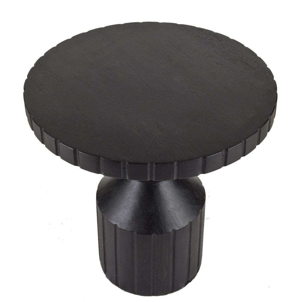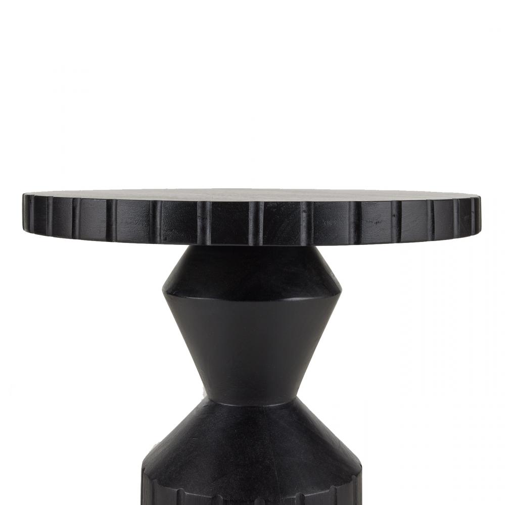 Accented with gear-like etching at the base and top, our machined end table possesses an industrial edge. Carved of ebony mango wood, the bold faceted shape highlights its totemic architecture. Finish will vary.