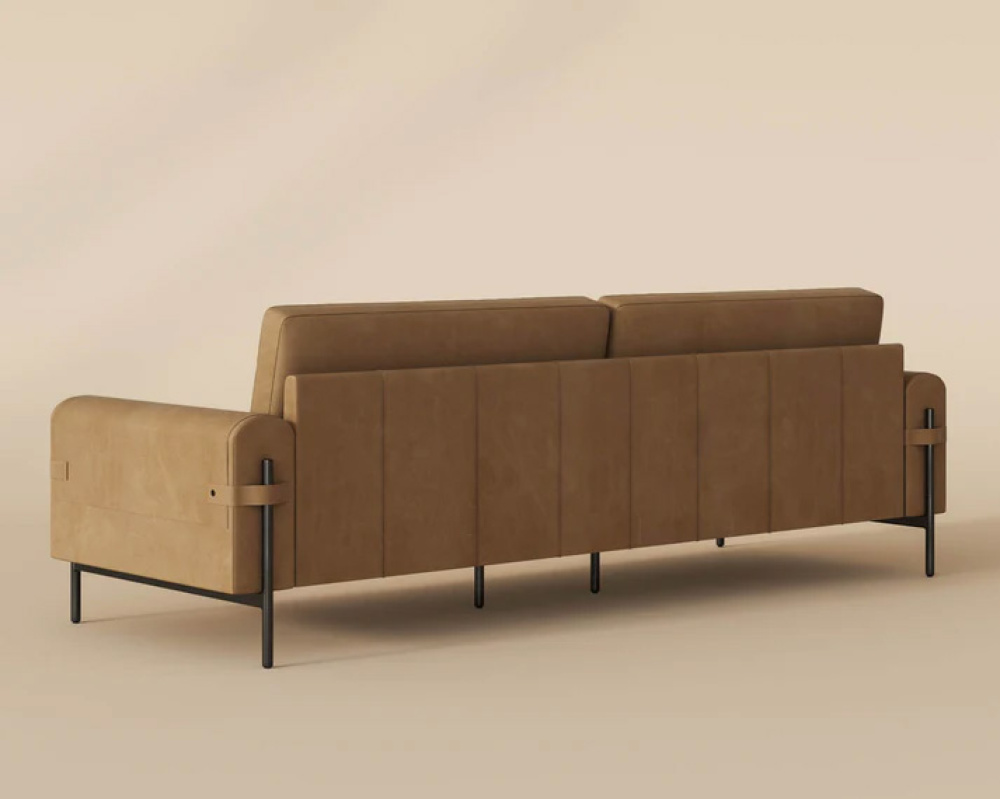 With its classic silhouette and low profile, the Camus Sofa will add comfort to any room. Generously upholstered in soft ludlow sesame leather that is as stylish as it is luxurious. Strap detailing on the front and back of the rounded armrests provide a playful accent to the piece. Completed with black iron legs. Handle with Care: This design has been crafted with top grain leather. Leather is a natural material; as such, colour variations, markings, wrinkles, grooves and light scratches are acceptable and appreciated characteristics. No two pieces are alike.
