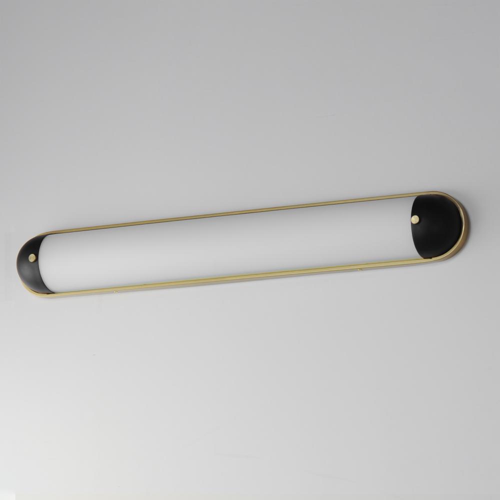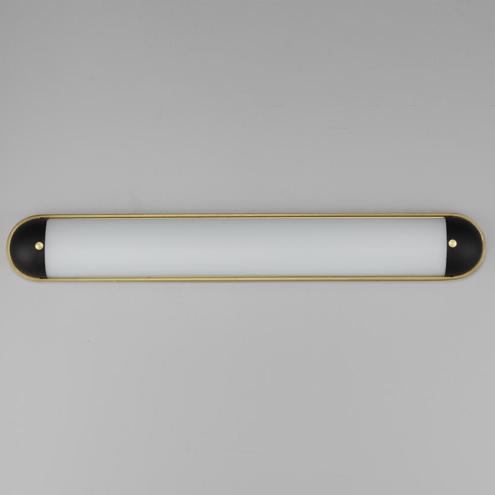 A convex curved glass is encapsulated at both ends to create an overall oval form. Available in a bold two-tone Black and Aged Brass finish or Polished Chrome, these wall sconces add sophistication to hallways and above bath vanities. The integrated LED te