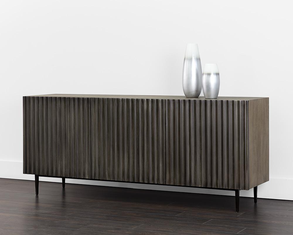 This bold sideboard will command attention through dining, living and lounge spaces. Features a grey mango wood frame with dramatic sculpted details on the face of the two cabinets. Steel legs complete the urban and contemporary look. Made in India. With refined craftsmanship, this design was brought to life by skilled local artisans. By nature, these materials develop unique imperfections such as fissures, markings and colour variations for a truly one-of-a-kind piece.