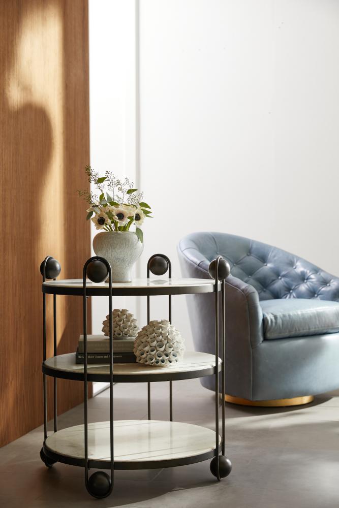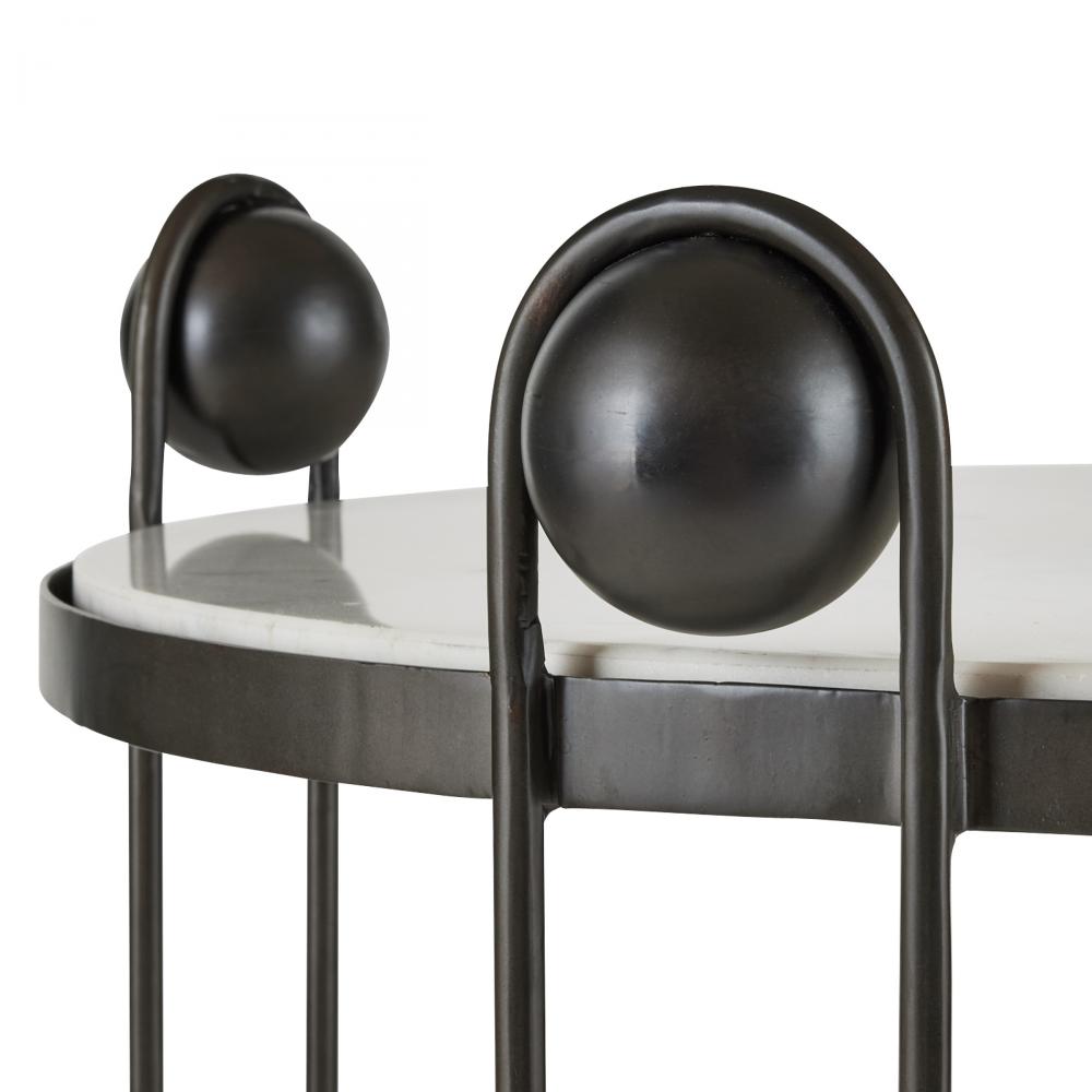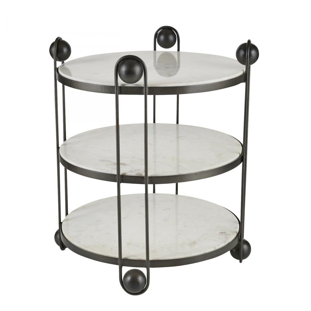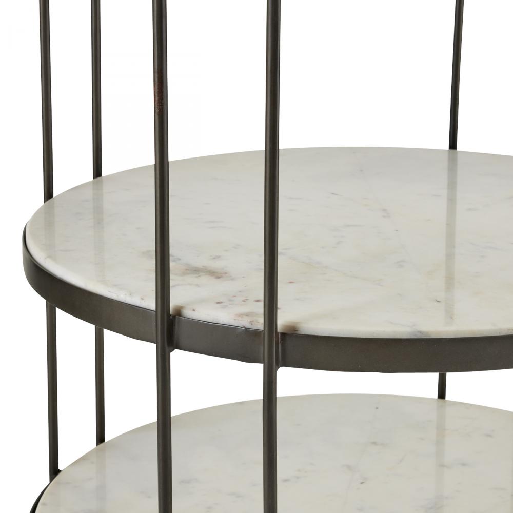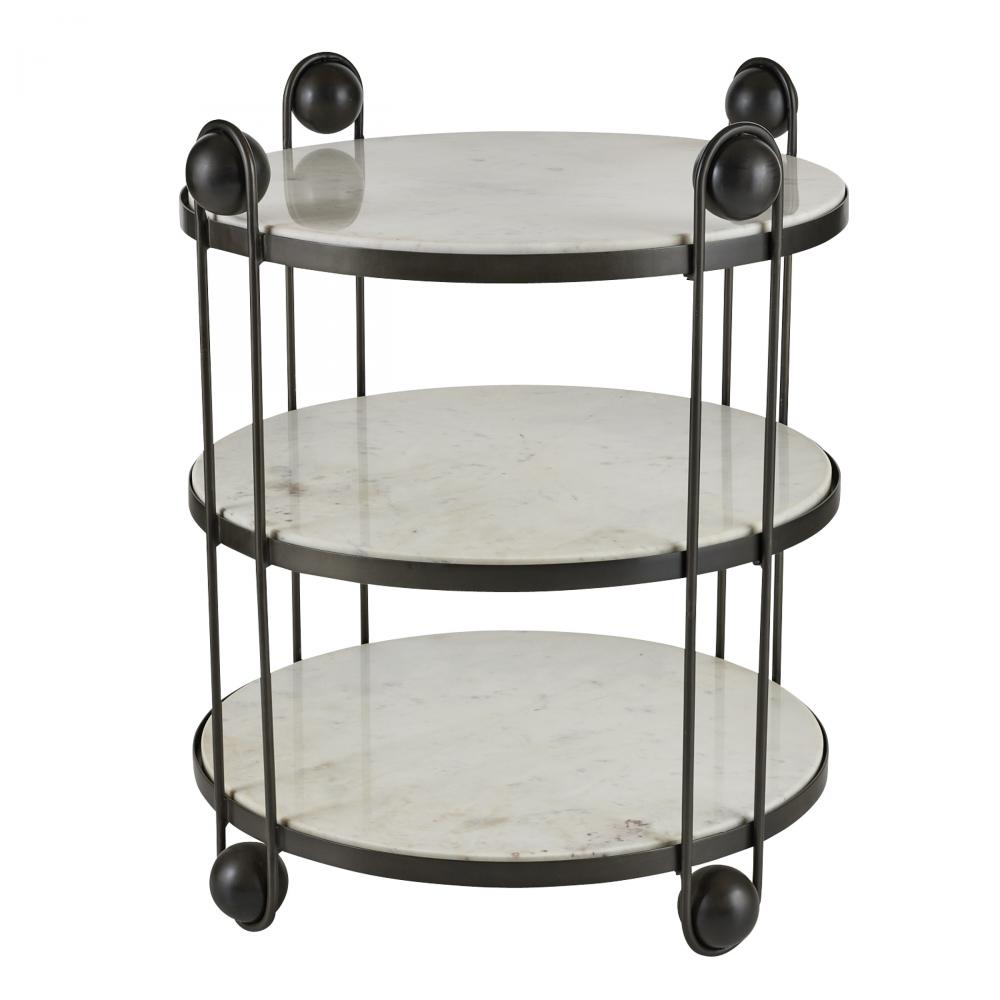 Clamped in a delicate framework of bronze-plated iron, a trio of white marble shelves makes an elegant end table or standing bar. Punctuated with polished bronze iron spheres at top and bottom. Finish will vary.