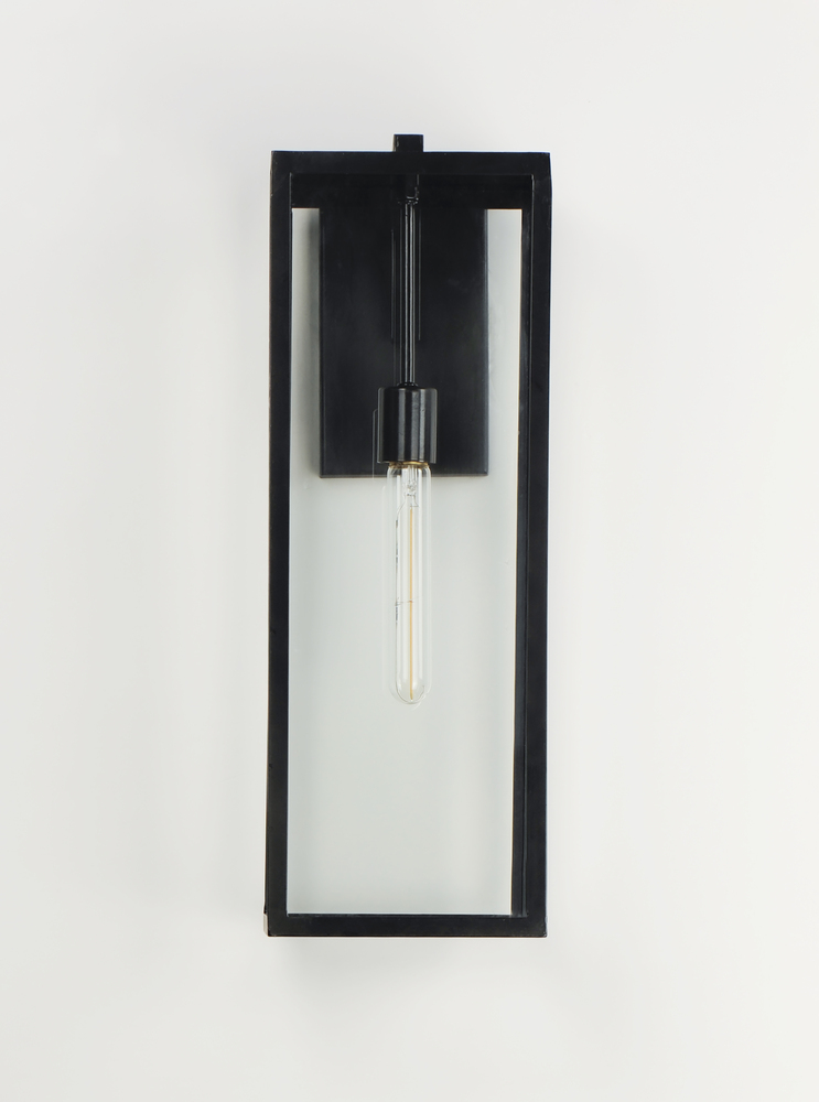 An elongated rectangular shaped design that is both minimalist and industrial. Die cast frames of Dark Bronze support Clear glass panels that provide an unobstructed view of the lantern's interior. Customize with your choice of lamps from vintage to tu