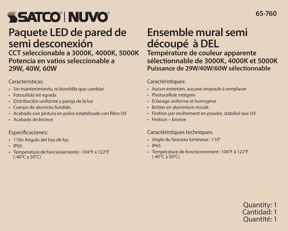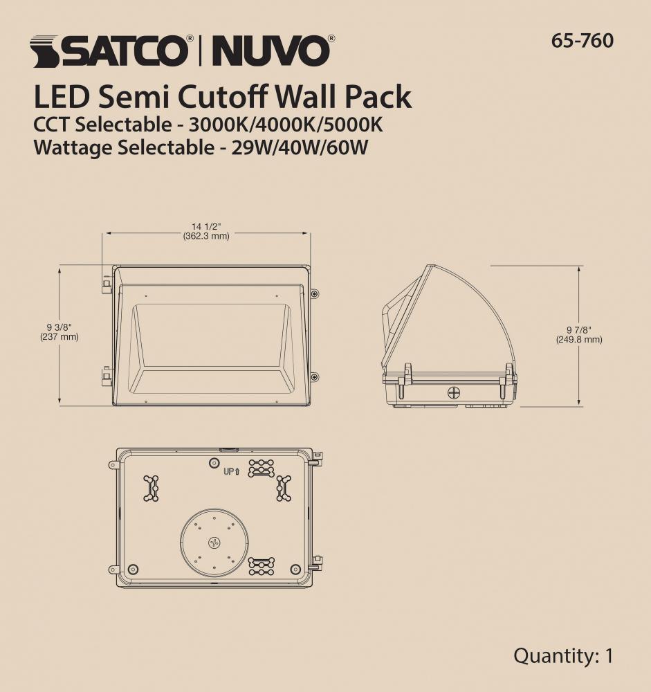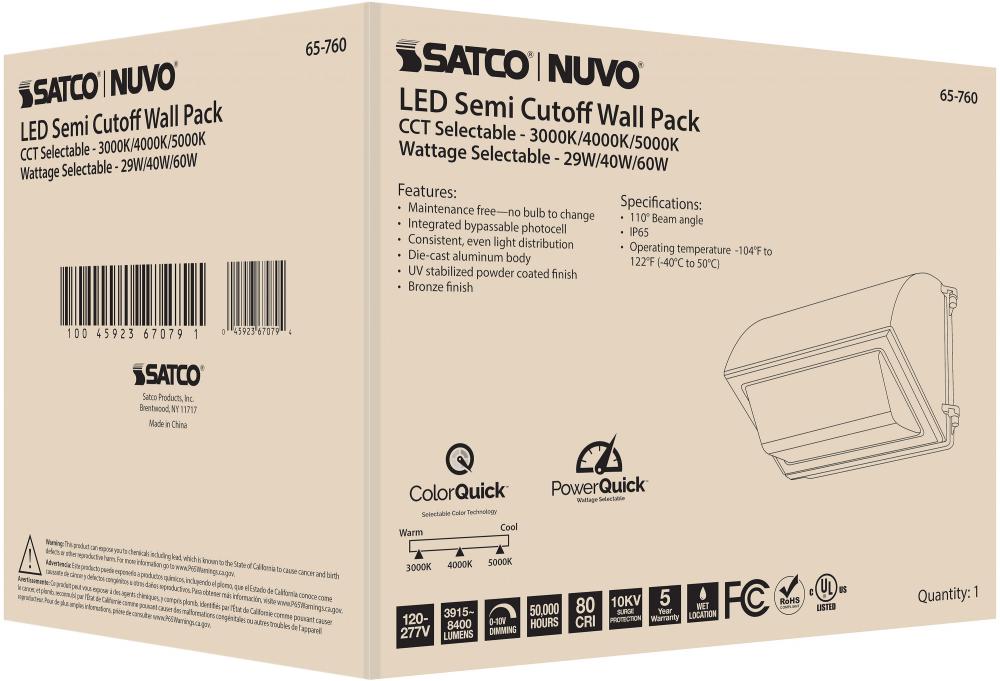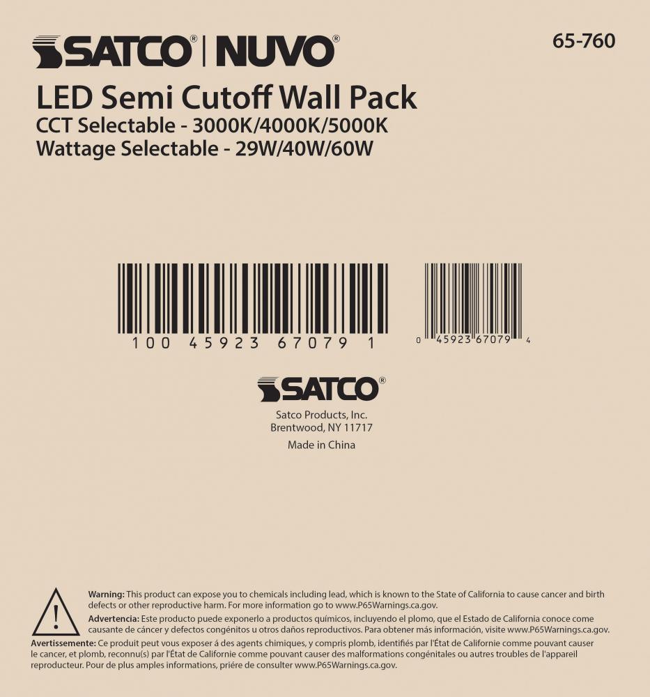 Introducing 65-760, SATCO NUVO's new CCT and Wattage selectable wall pack with integrated bypassable photocell. This cULus certified wall pack is offered in a semi-cutoff style with 29W/40W/60W wattage configurations, CCT selectable temperatures of 300